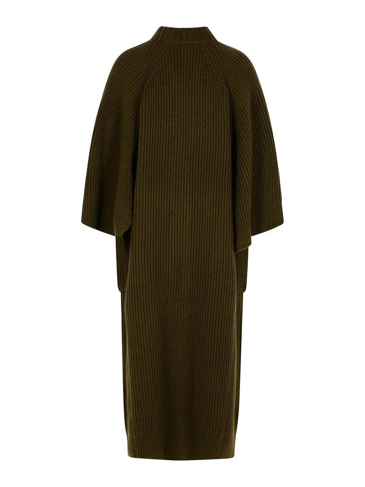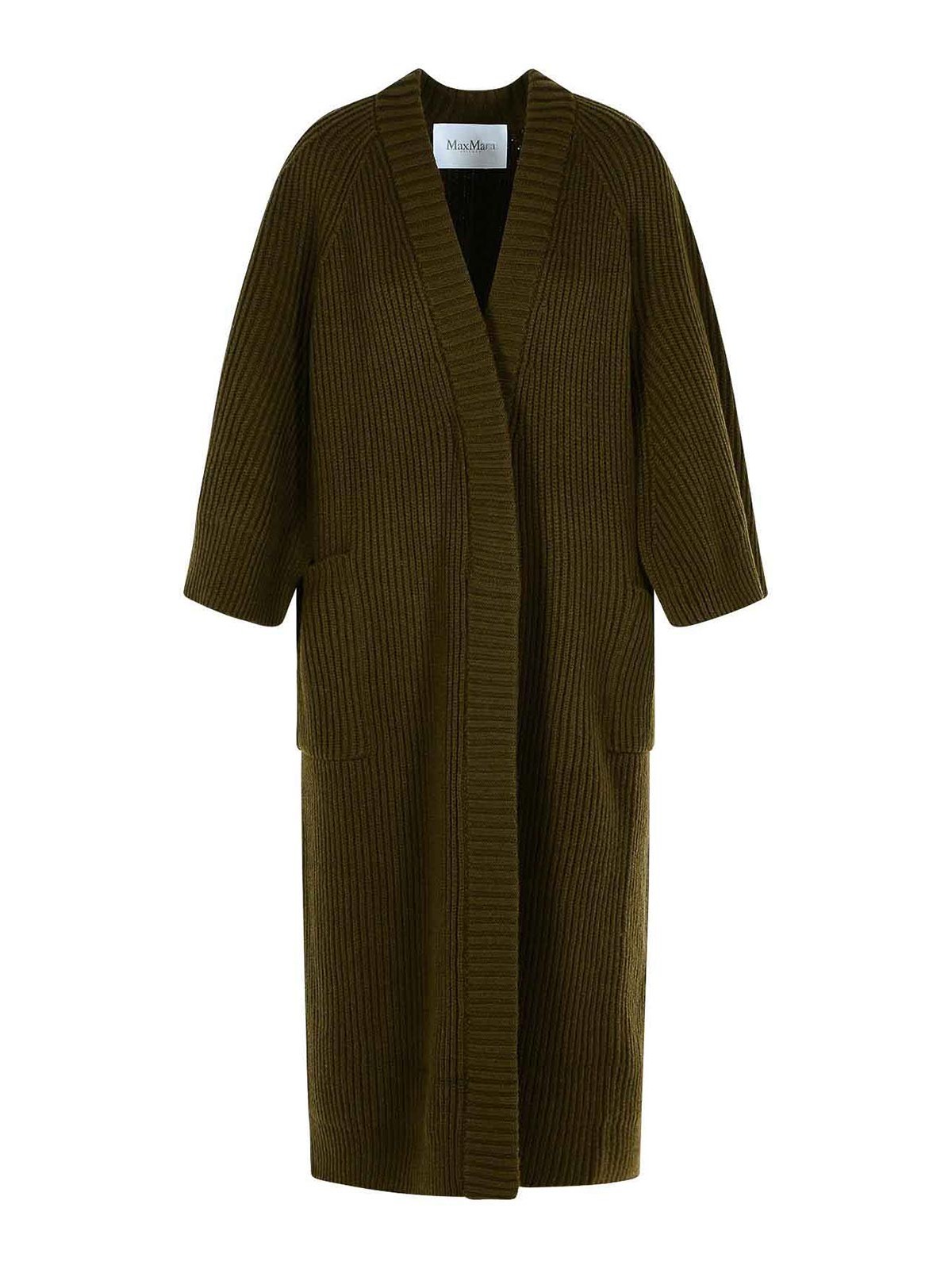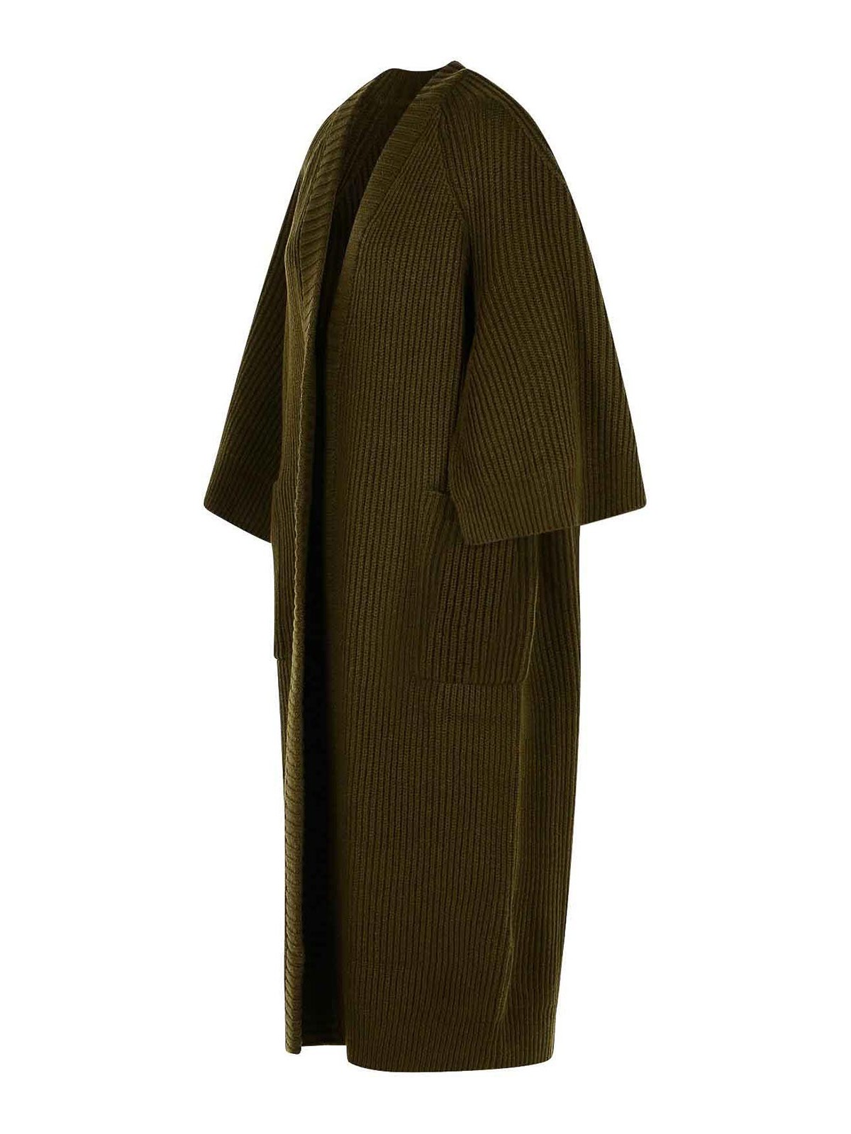 English ribbed wool and cachemire yarn cardigan, loose fit, 3/4 sleeves with open cut in the underarm detail, patch pockets on the sides, ribbed trims