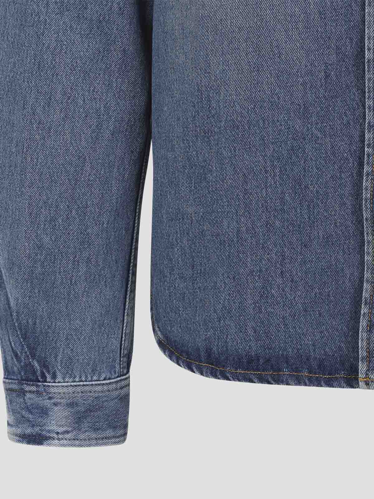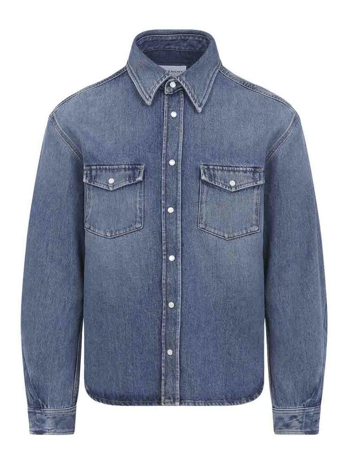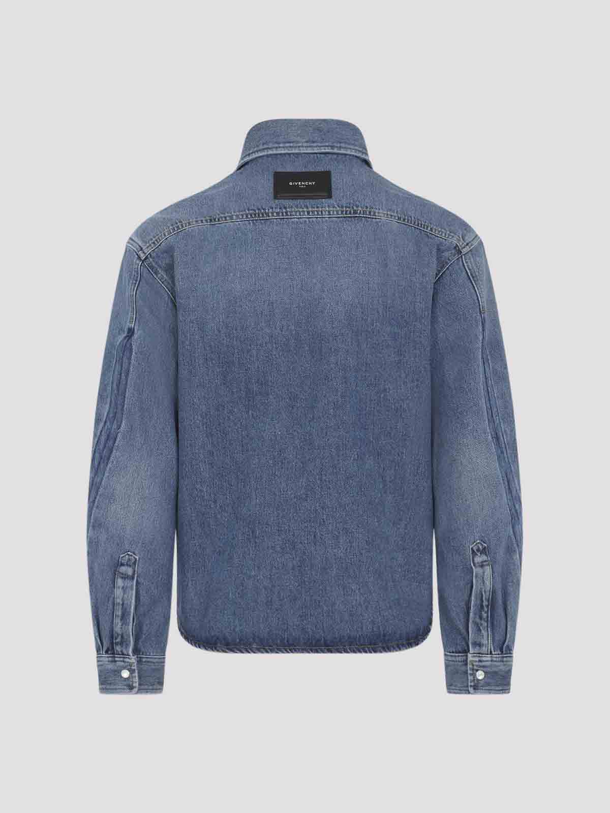 Givenchy blue classic shirt. crafted from bleached blue cotton denim, featuring a pointed collar, mother-of-pearl buttons, front button fastening, two flap pockets placed on the chest, long sleeves with buttoned cuffs, a back yoke with a branded leather label detail, and a rounded hem.
