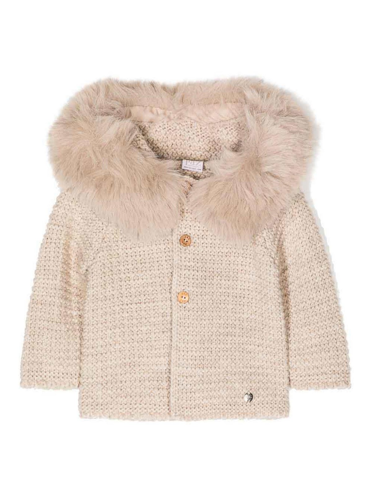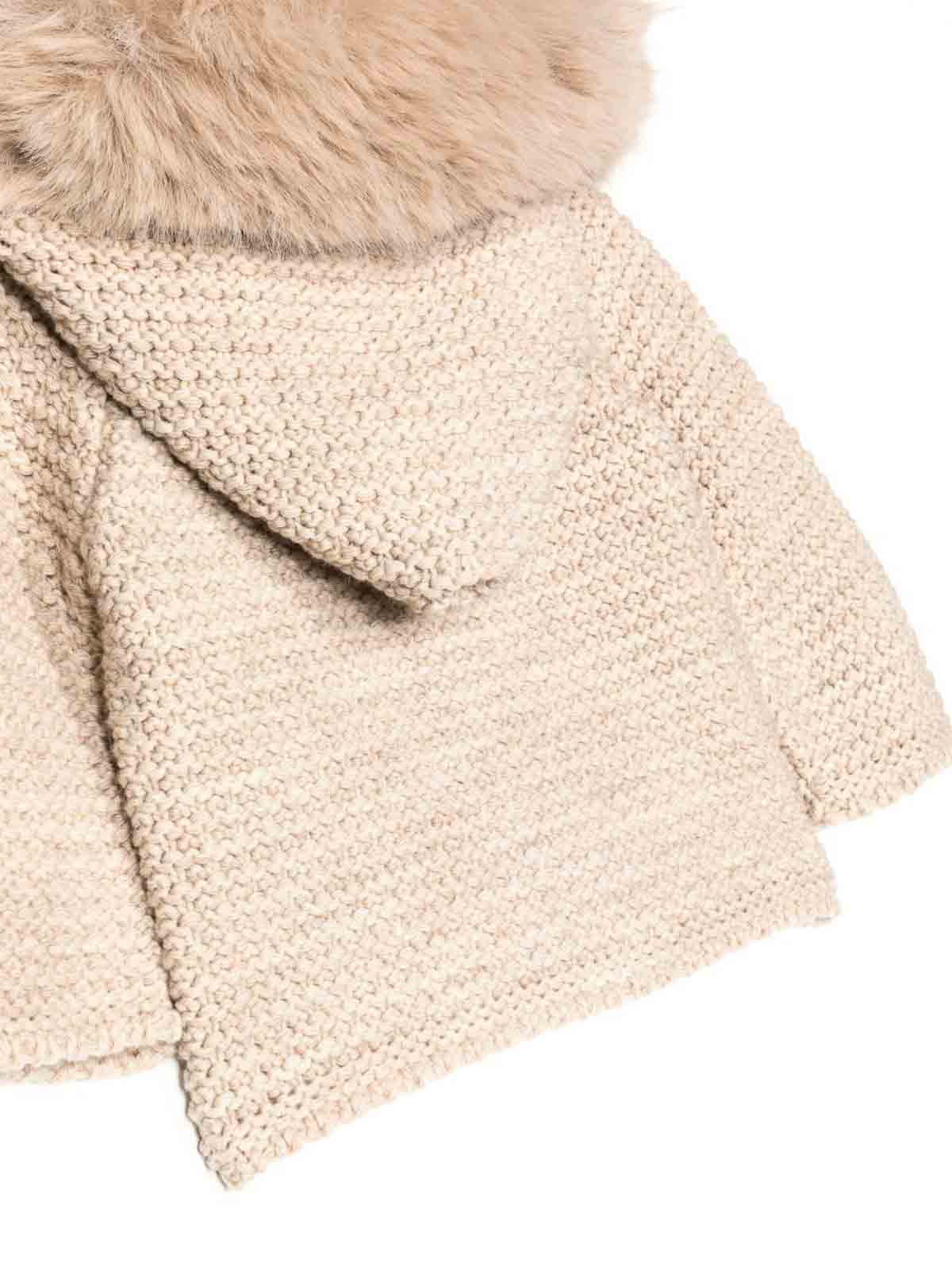 Hooded coat features light blue knitted faux fur collar button front hood long sleeves straight hem
