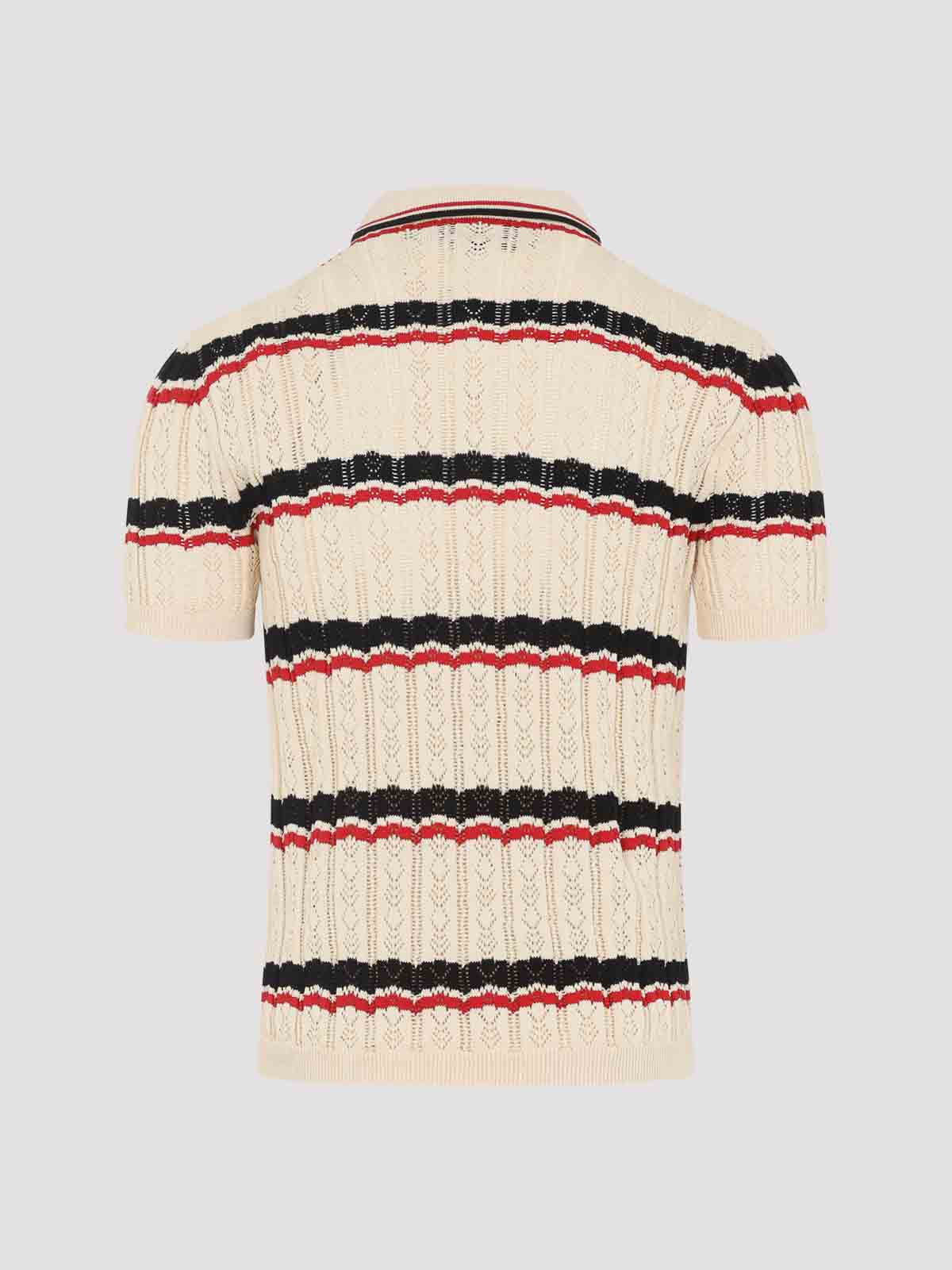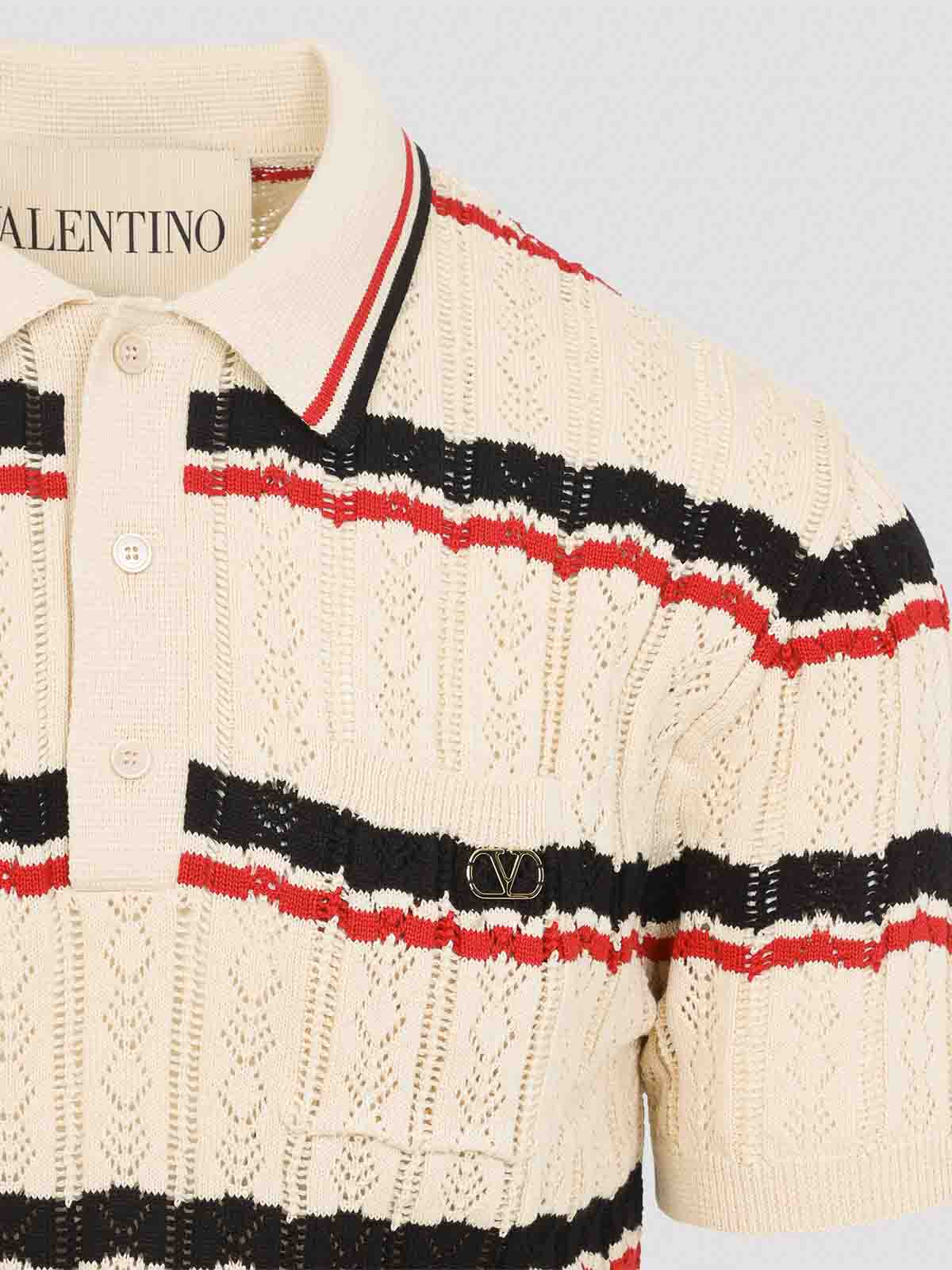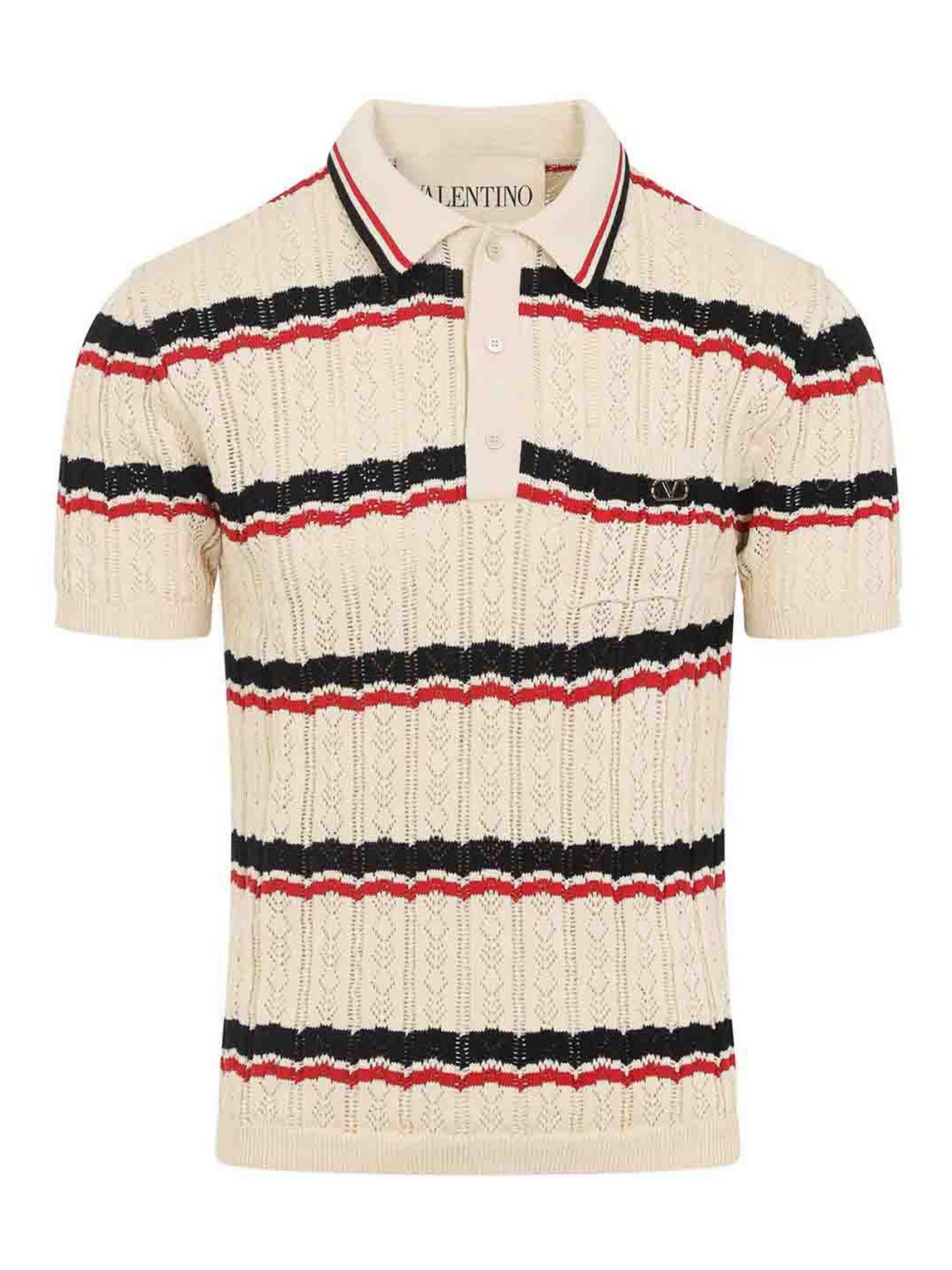 Valentino ivory cotton polo. ivory knitted cotton, red and black striped pattern all over, polo collar, three-button front fastening, patch pocket with metal vlogo detail at the chest, short sleeves, ribbed edges, straight hem.