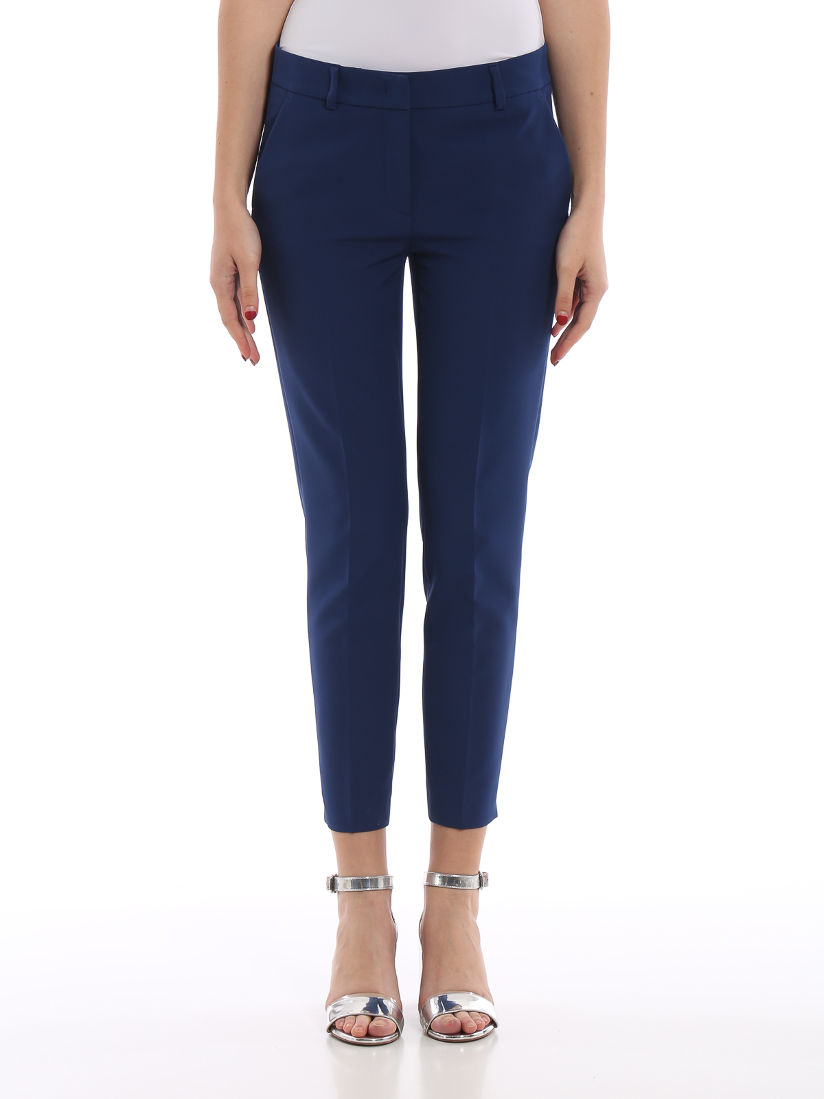 Crepe capri trousers featuring hook and zip closure, two side open pockets, two rear welt pockets and small vents at bottom.