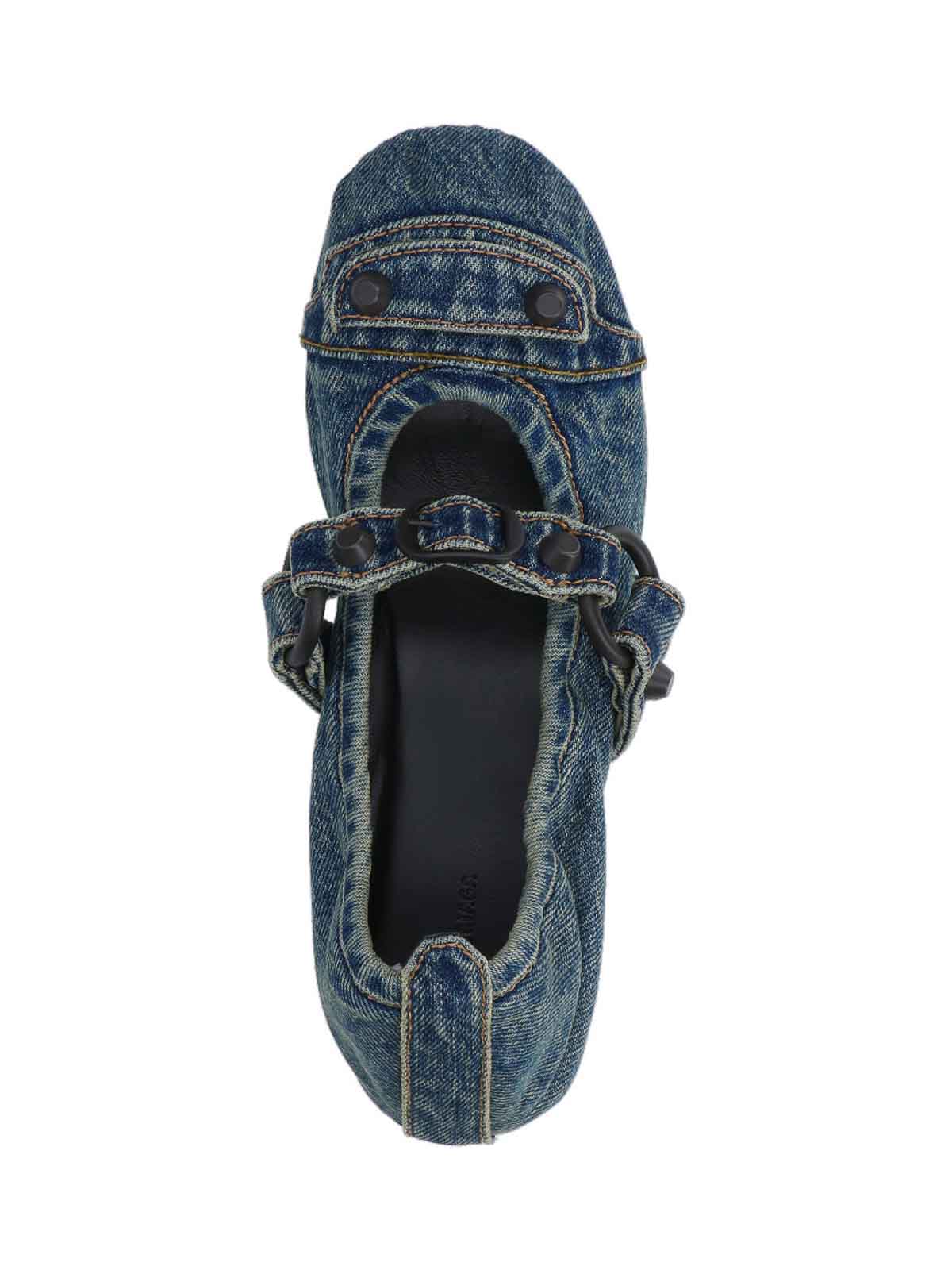 Balenciaga city ballet flats, in blue cotton denim, worn effect, round toe, adjustable buckle closure, silver metal stud detail, slip-on fit, rubber sole.
