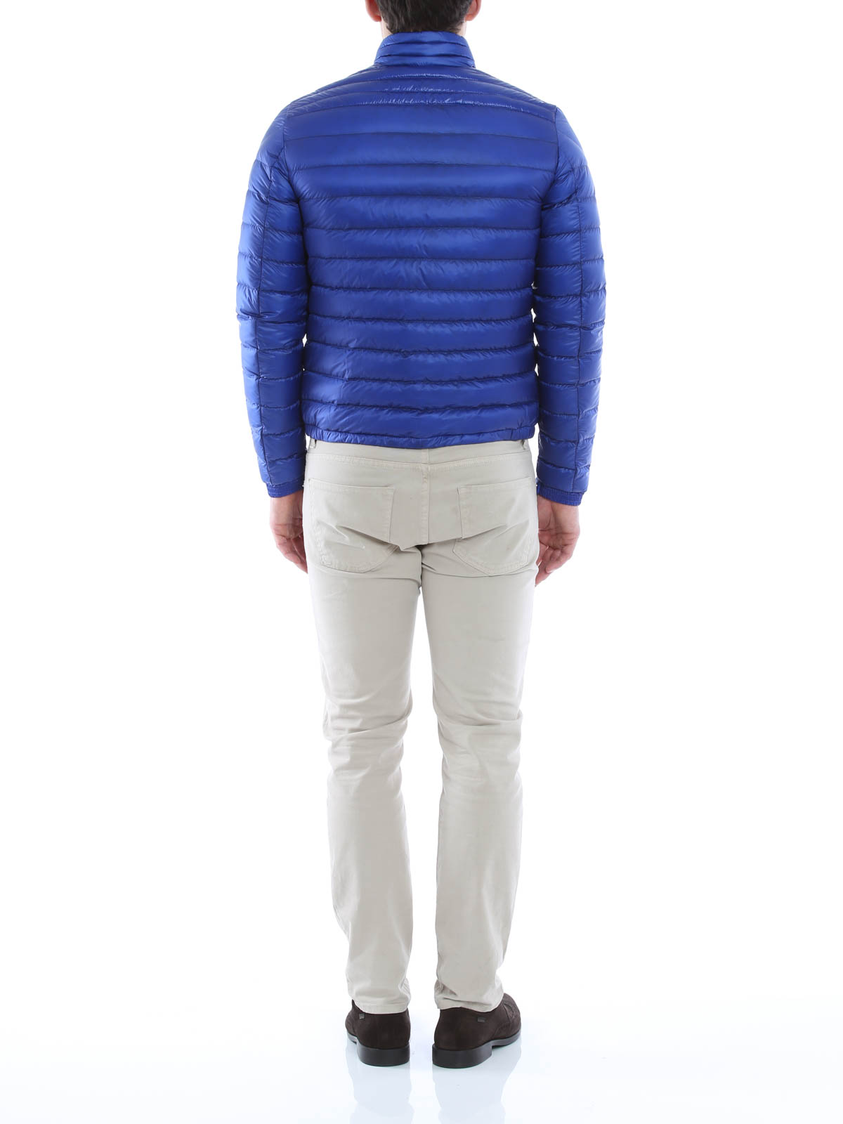Quilted tech-fabric jacket with down goose padding featuring a standing collar, a two-way front zip fastening, elasticated cuffs and bottom hem, a logo patch to the left arm, side zipped pockets, a straight hem and contrasting striped zip trims. Inner zip pocket, down proof and water-repellent treatment. Lined.