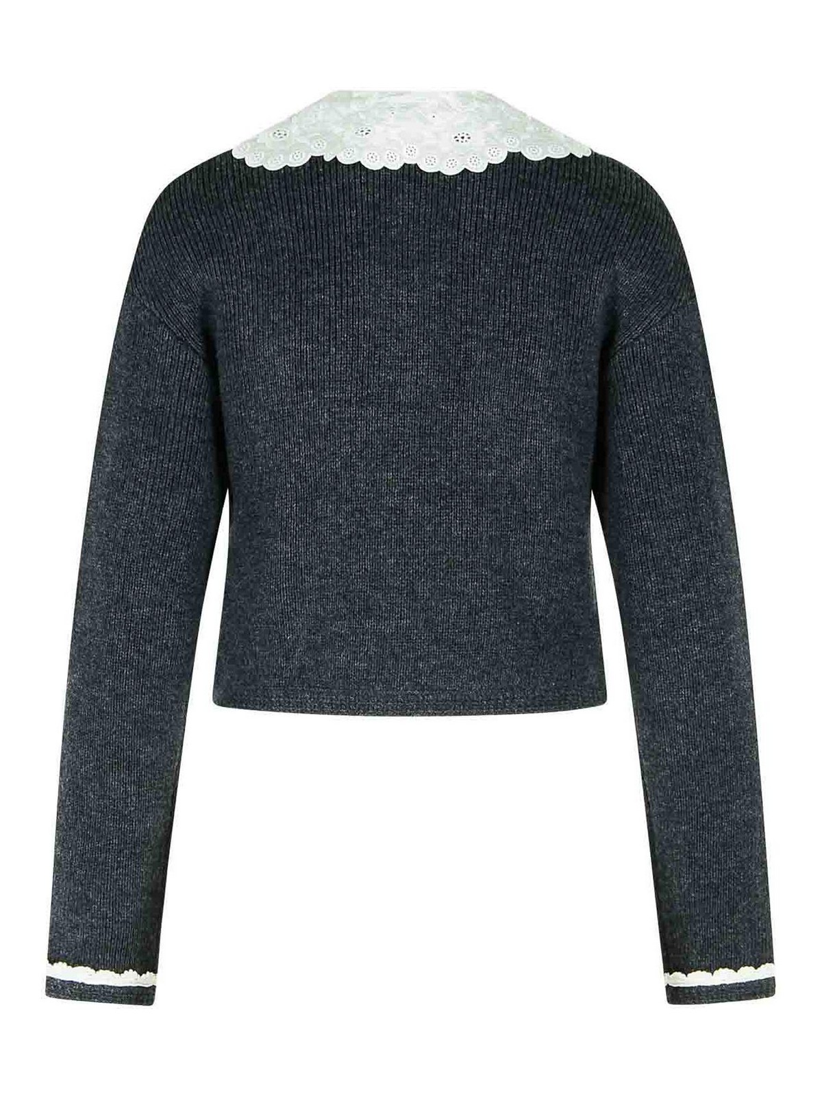 Large contrasting lace removable collar, knitted with ribbed finish, decorative buttons, hook closure, button welt pockets, lace detail on the sleeve hem