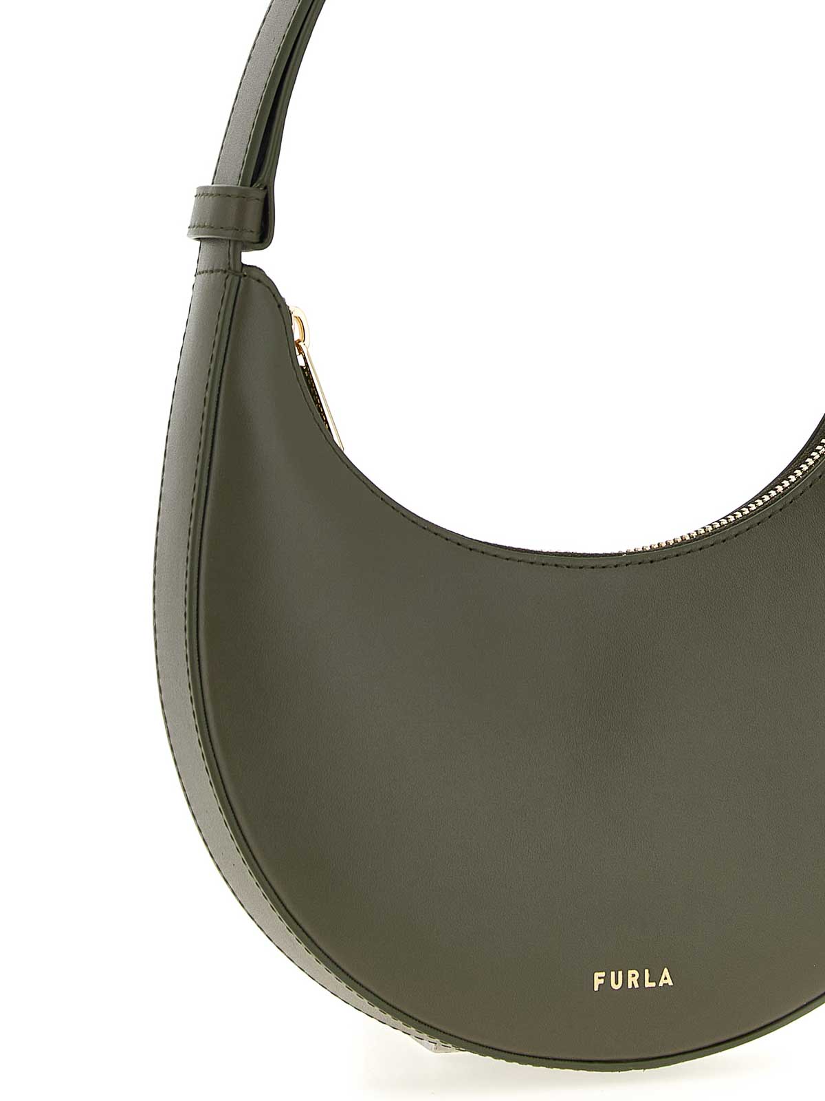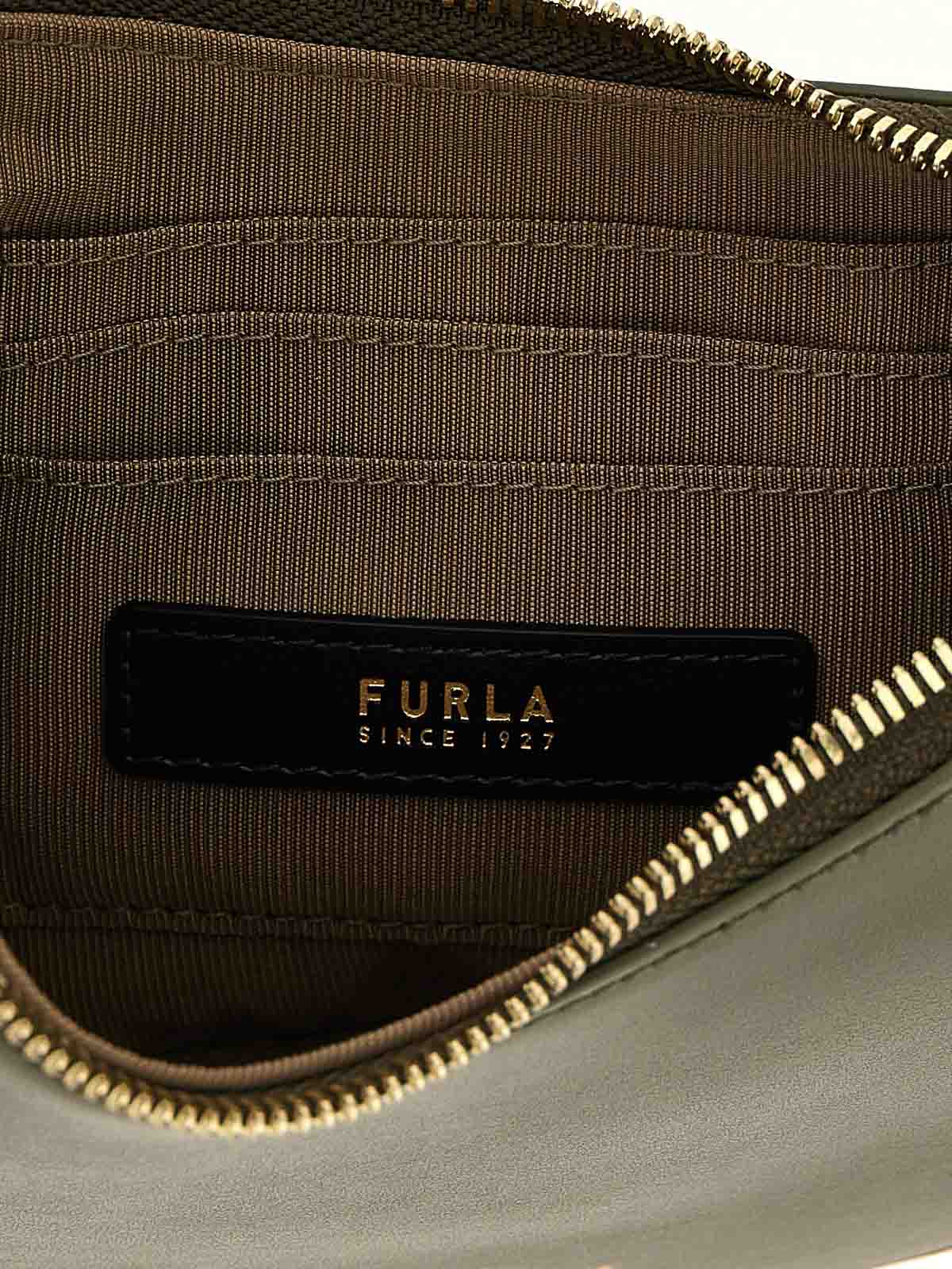 furla delizia' mini leather shoulder bag with a silky and smooth touch, rigid crescent structure, front embossed logo, top zip closure, adjustable handle with metal swivel mechanism.