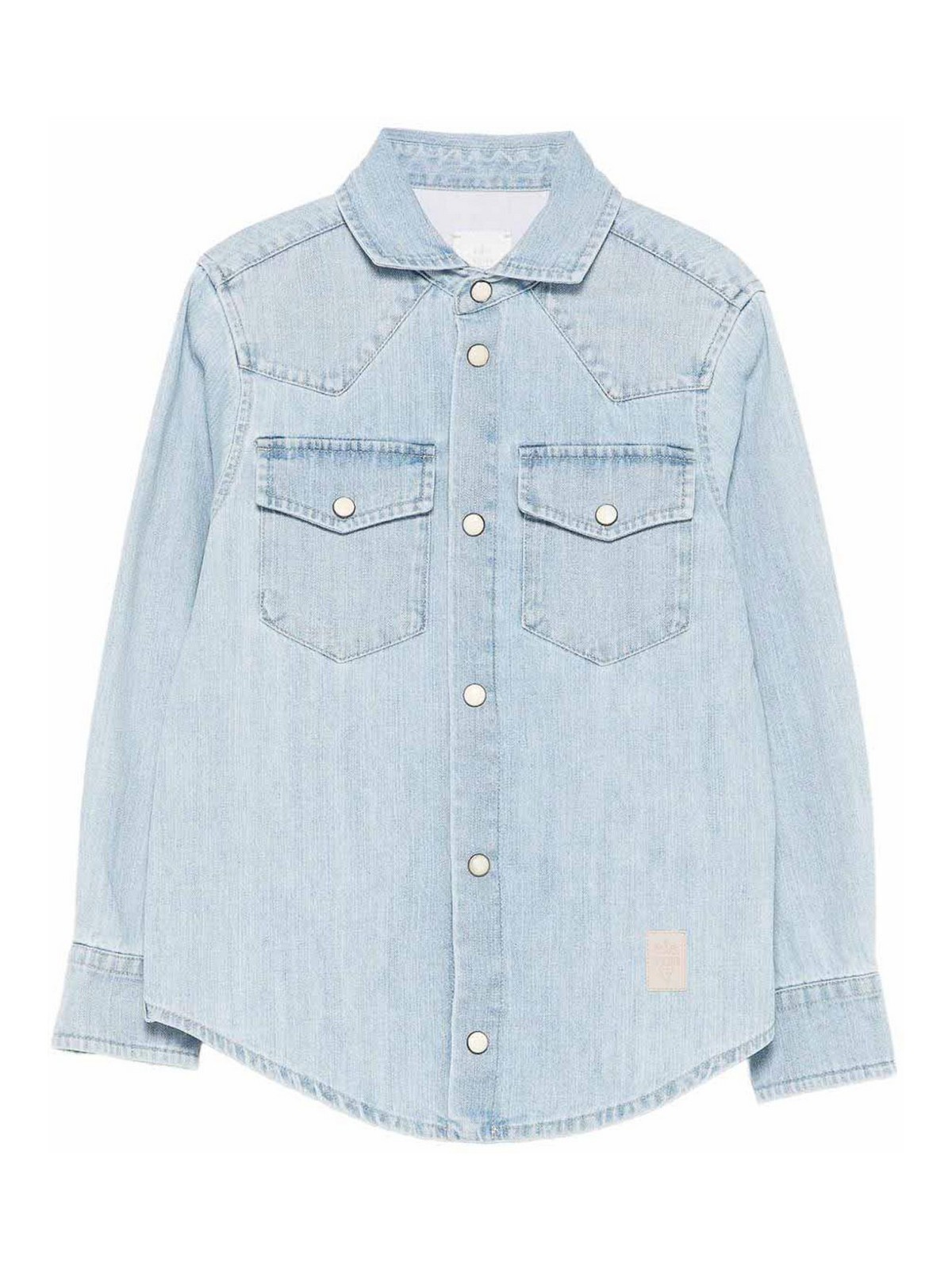 Denim shirt with logo, light blue features with buttons, logo application, long sleeves, pointed collar, curved hem
