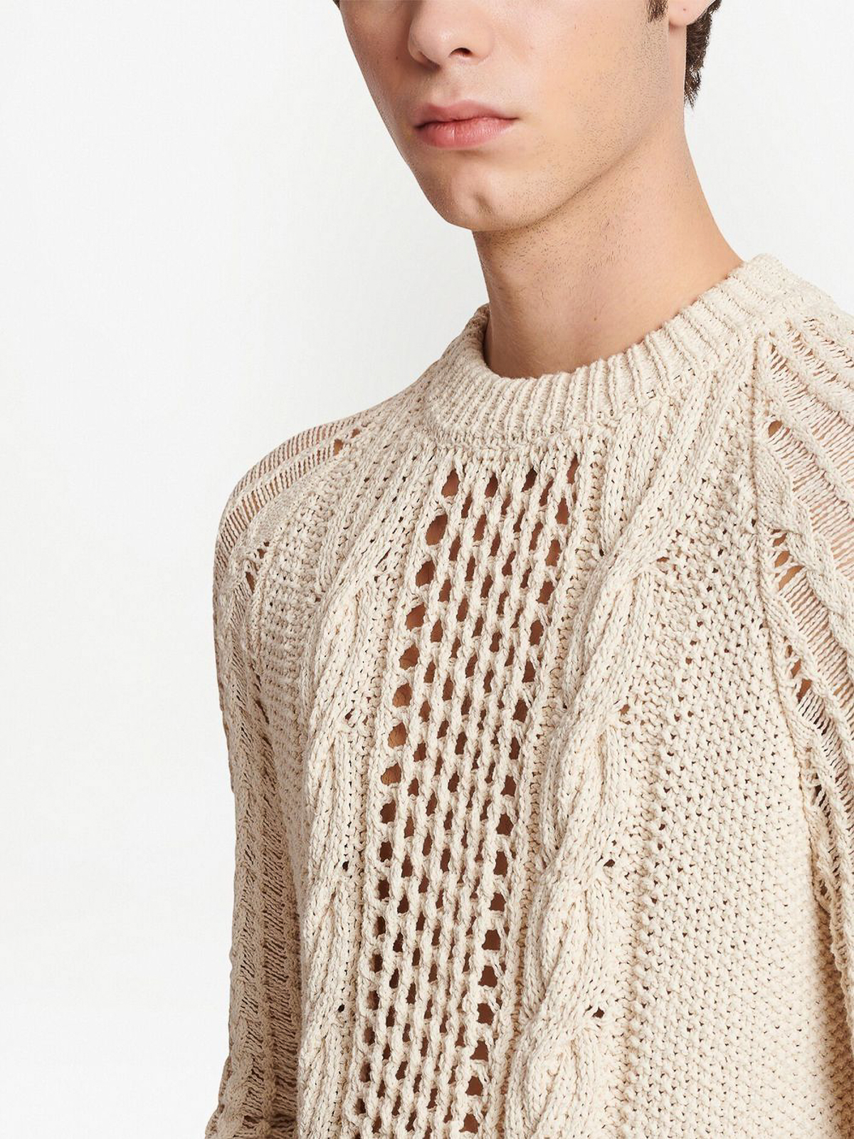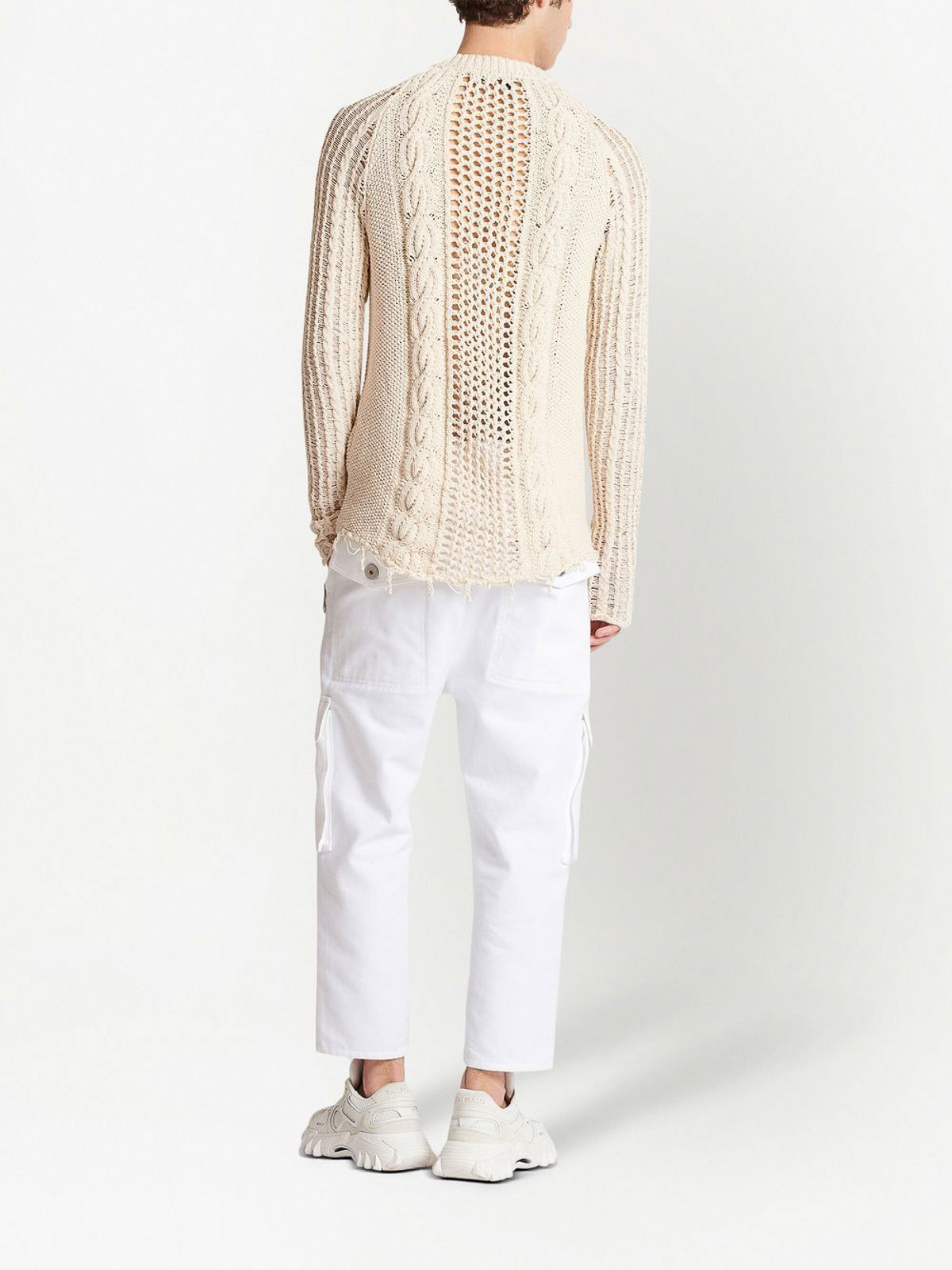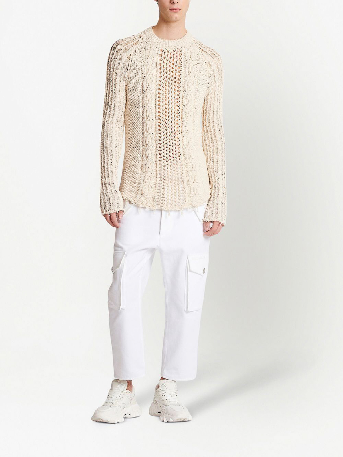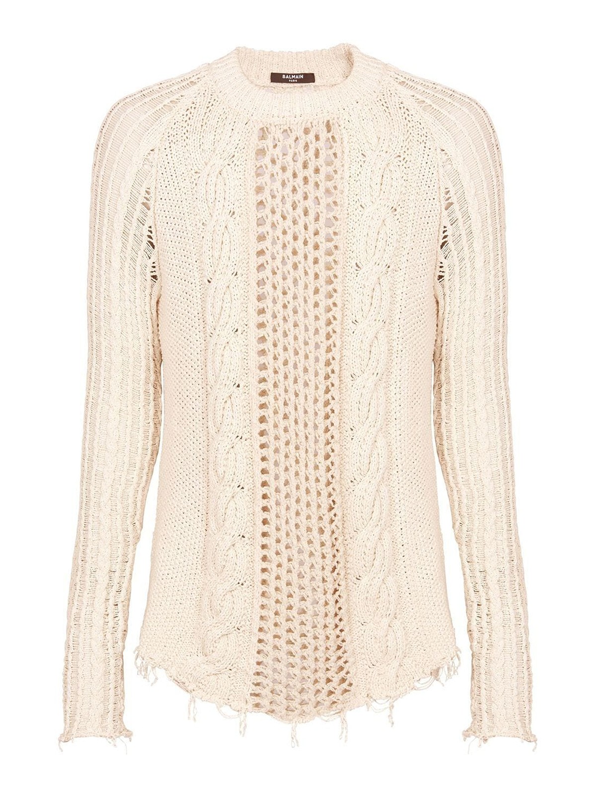 Distressed cable-knit jumper from balmain featuring beige distressed effect cable knit cotton-blend crew neck long sleeves and straight hem