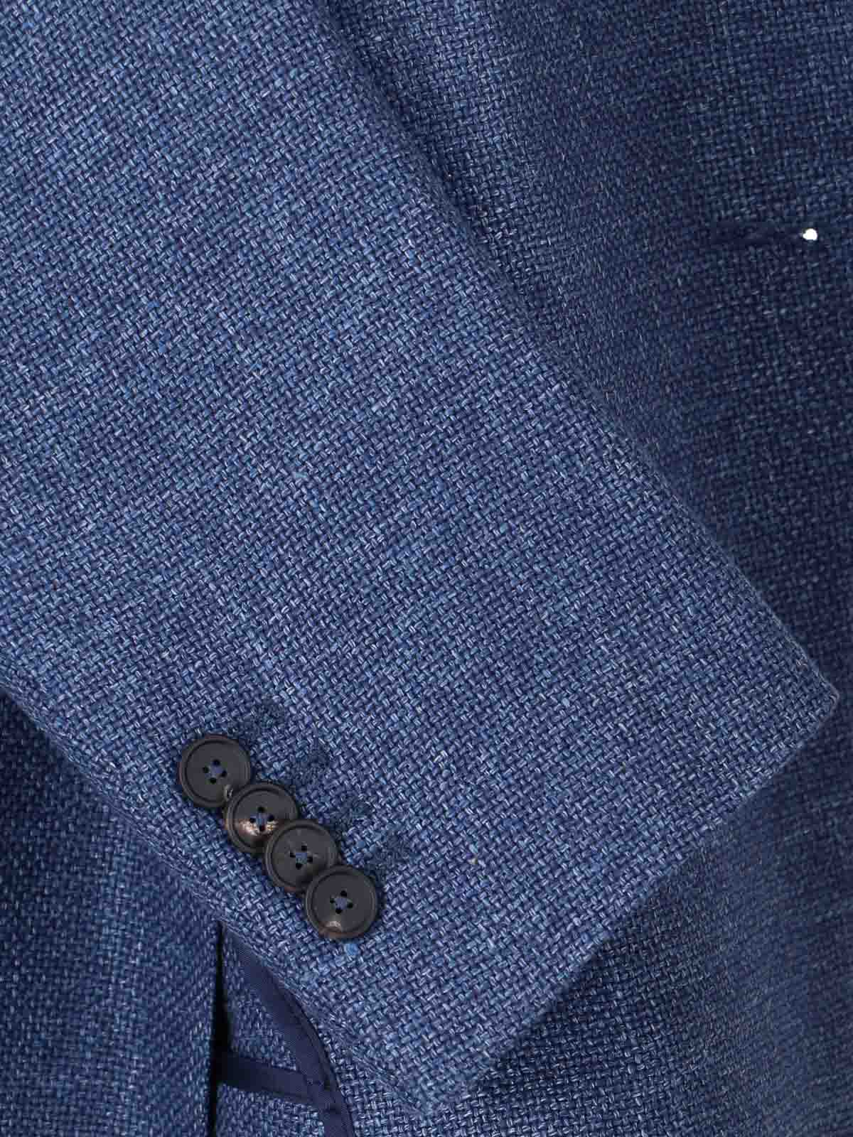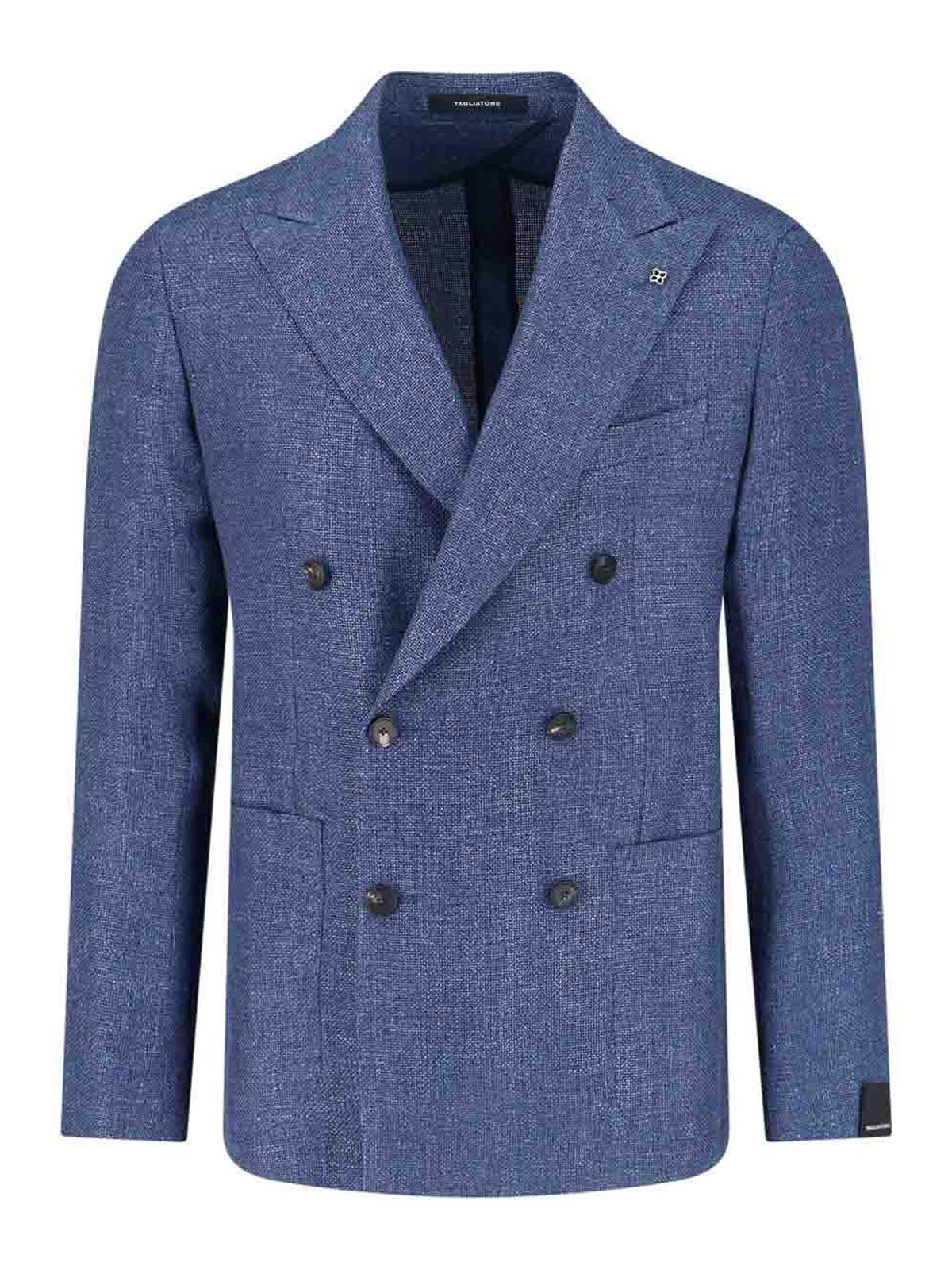 Tagliatore double-breasted blazer, made exclusively for sugar, in blue virgin wool and linen blend, lapels, long sleeves, double-breasted button closure, two front pockets.
