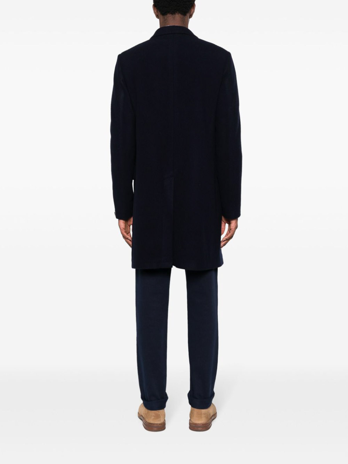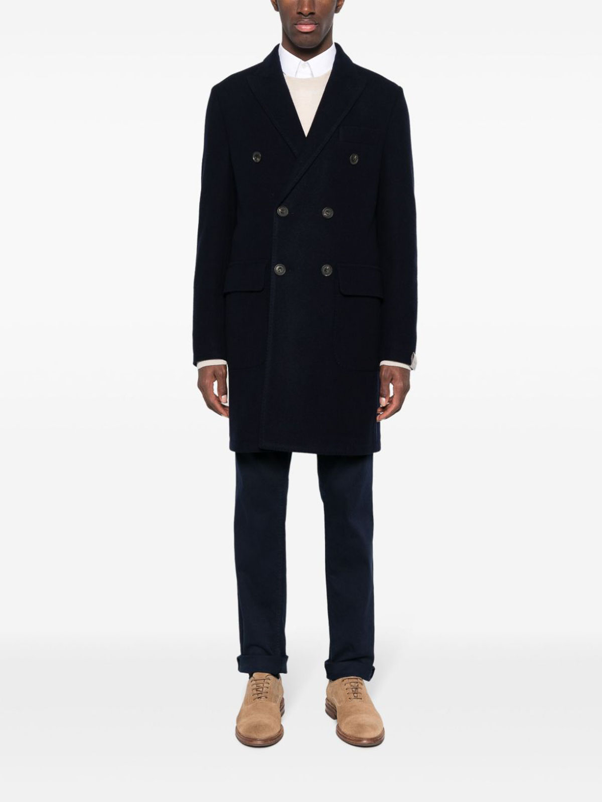 Navy blue tonal stitching peak lapels coat with double-breasted button by corneliani featuring long sleeves buttoned cuffs chest welt pocket two flap pockets central rear vent straight hem