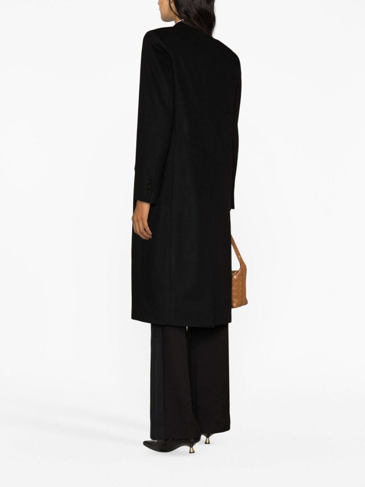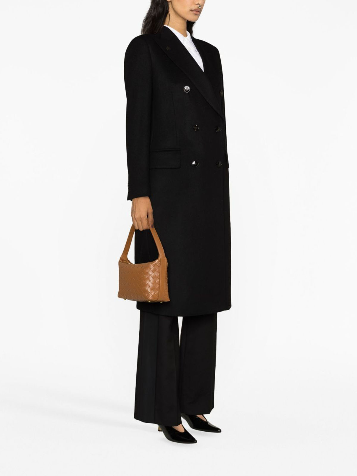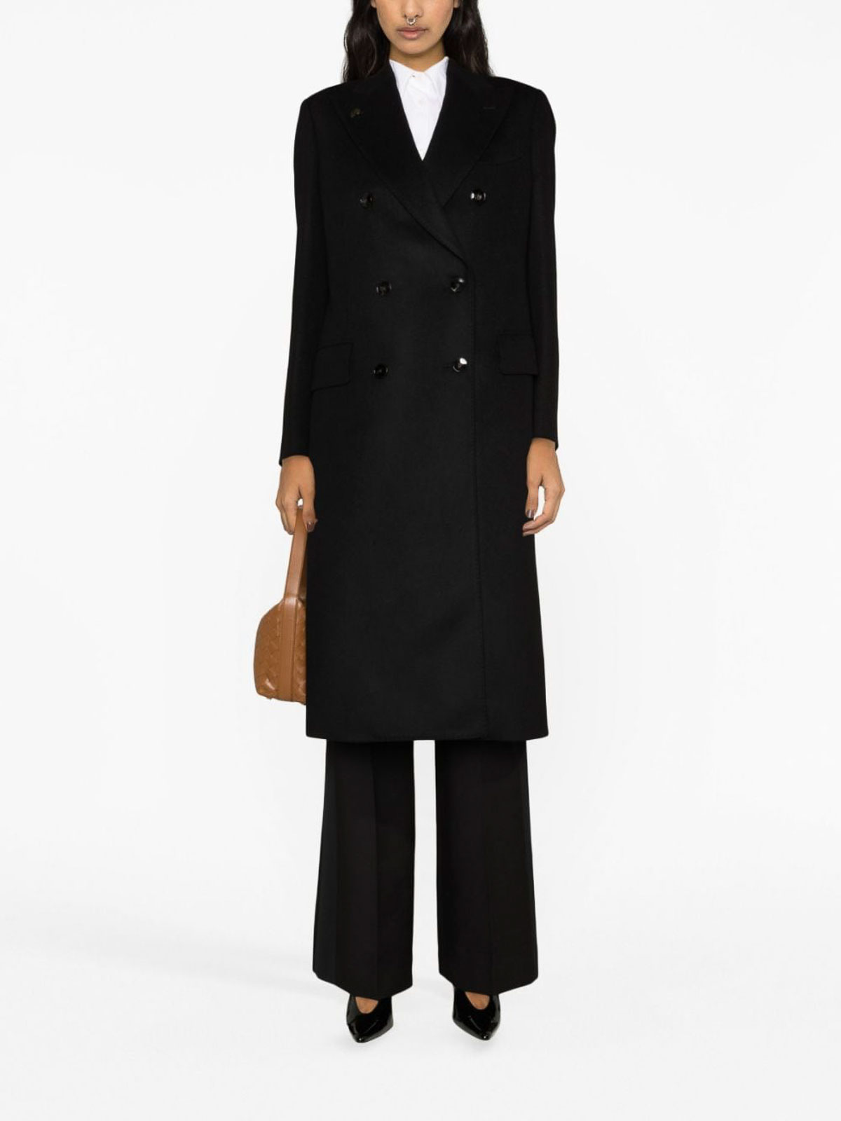 Double-breasted long coat from gabriele pasini featuring black virgin, blend logo plaque notched lapels double-breasted button chest welt pocket two flap pockets shoulder pads long sleeves buttoned cuffs straight hem and knee-length