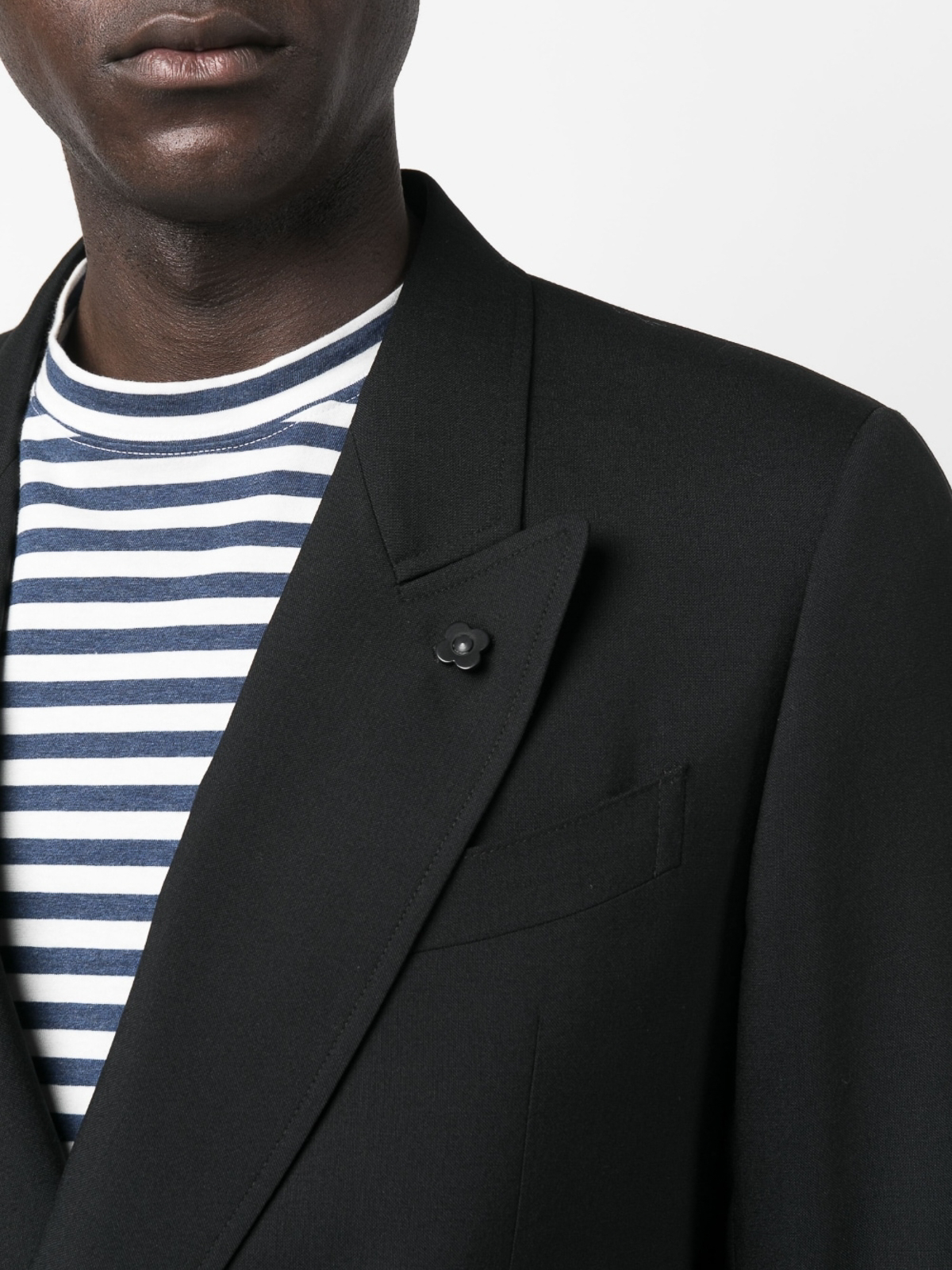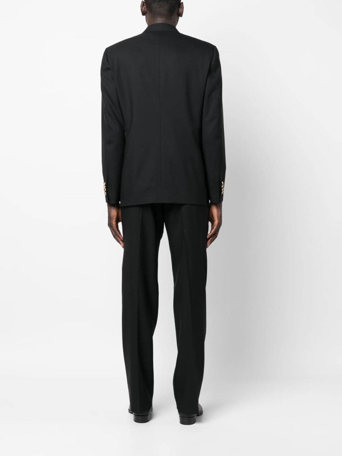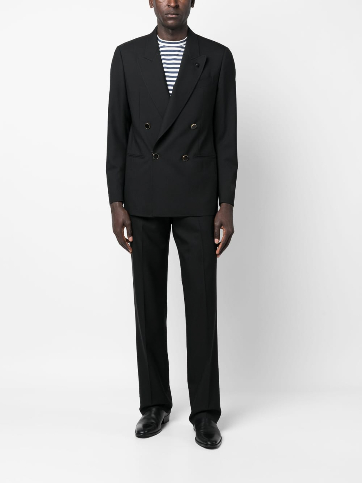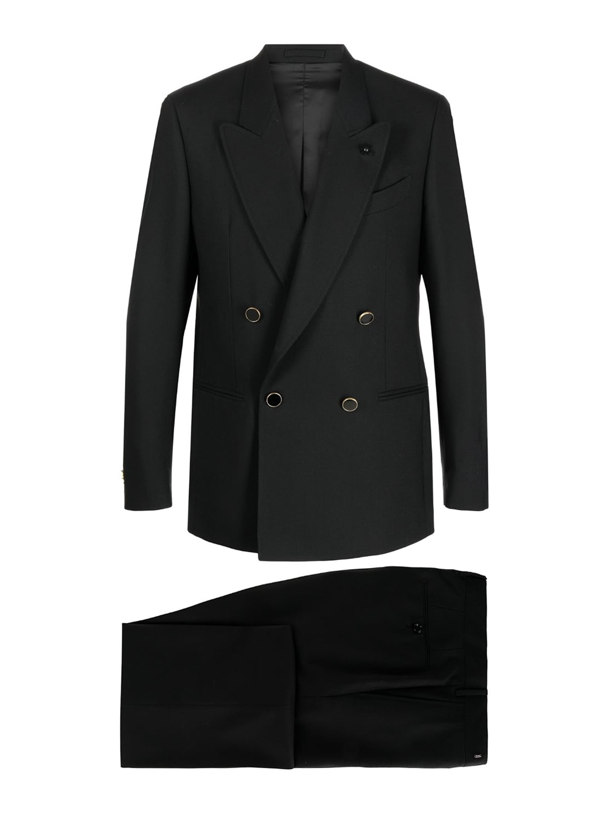 Double-breasted wool suit from lardini featuring black, wool, tonal logo plaque, peak lapels, double-breasted button fastening, long sleeves, buttoned cuffs, chest welt pocket, two front welt pockets, straight hem, straight leg, concealed front fastening, belt loops, two side inset pockets, two rear button-fastening pockets and pressed crease.