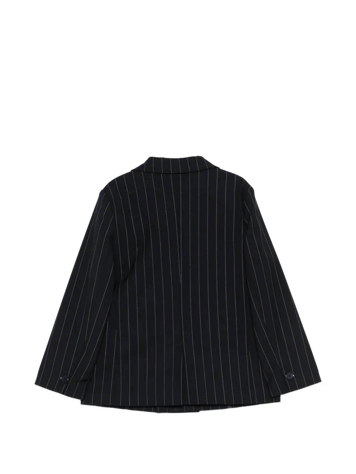Double-breasted jacket features blue double-breasted pinstripe design with buttons, pointed lapels, welt pockets