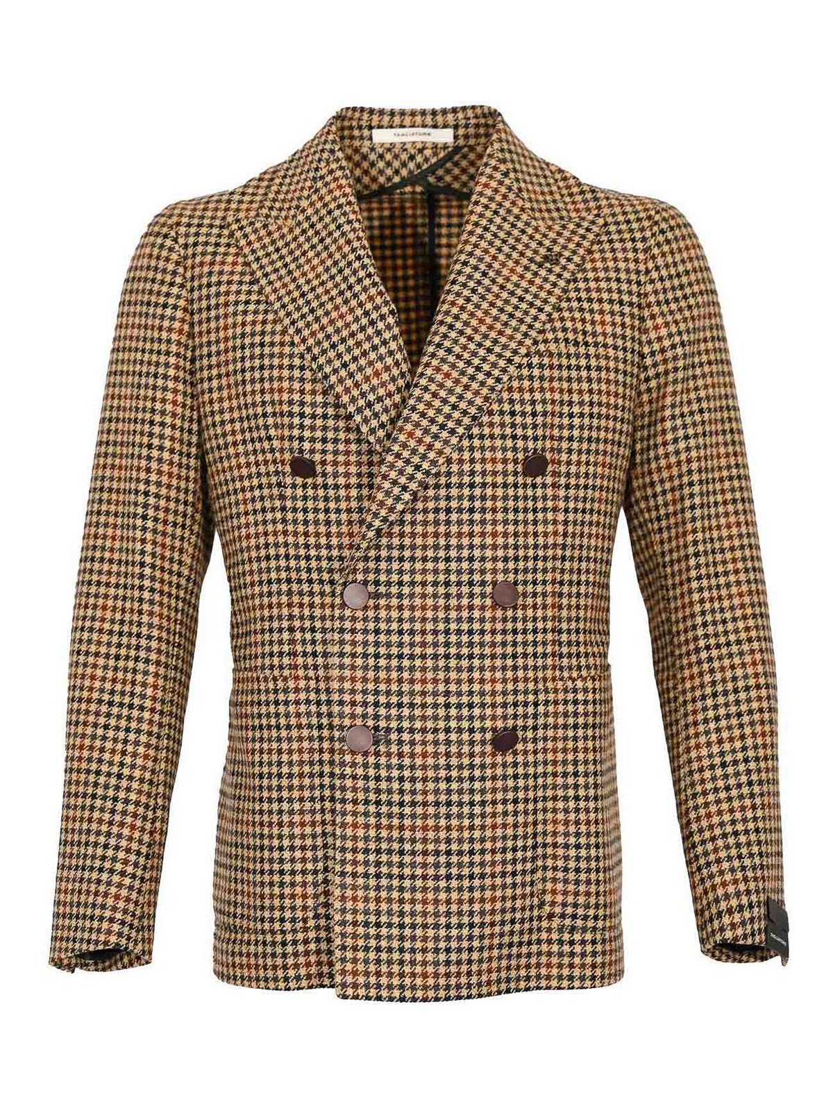 Double, breasted and blend jacket tagliatore and blend with a soft warm finish pattern micro houndstooth in shades of brown and blue sleeves long with four, button cuffs collar classic peak lapel double, breasted with buttons pockets two flap pockets and a chest pocket rear side vents tailored construction partially lined lined partially lined fit regular