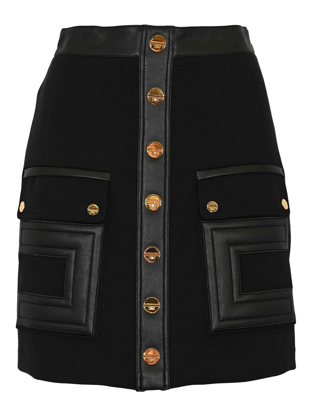 Double crepe mini skirt elisabetta franchi style with logo double crepe pattern solid black with, look waist high with, look strap with logo buttons pockets two patch pockets with flaps and buttons length short faux with stitched trim custom elisabetta franchi buttons rigid structure that enhances the silhouette lined yes fit slim