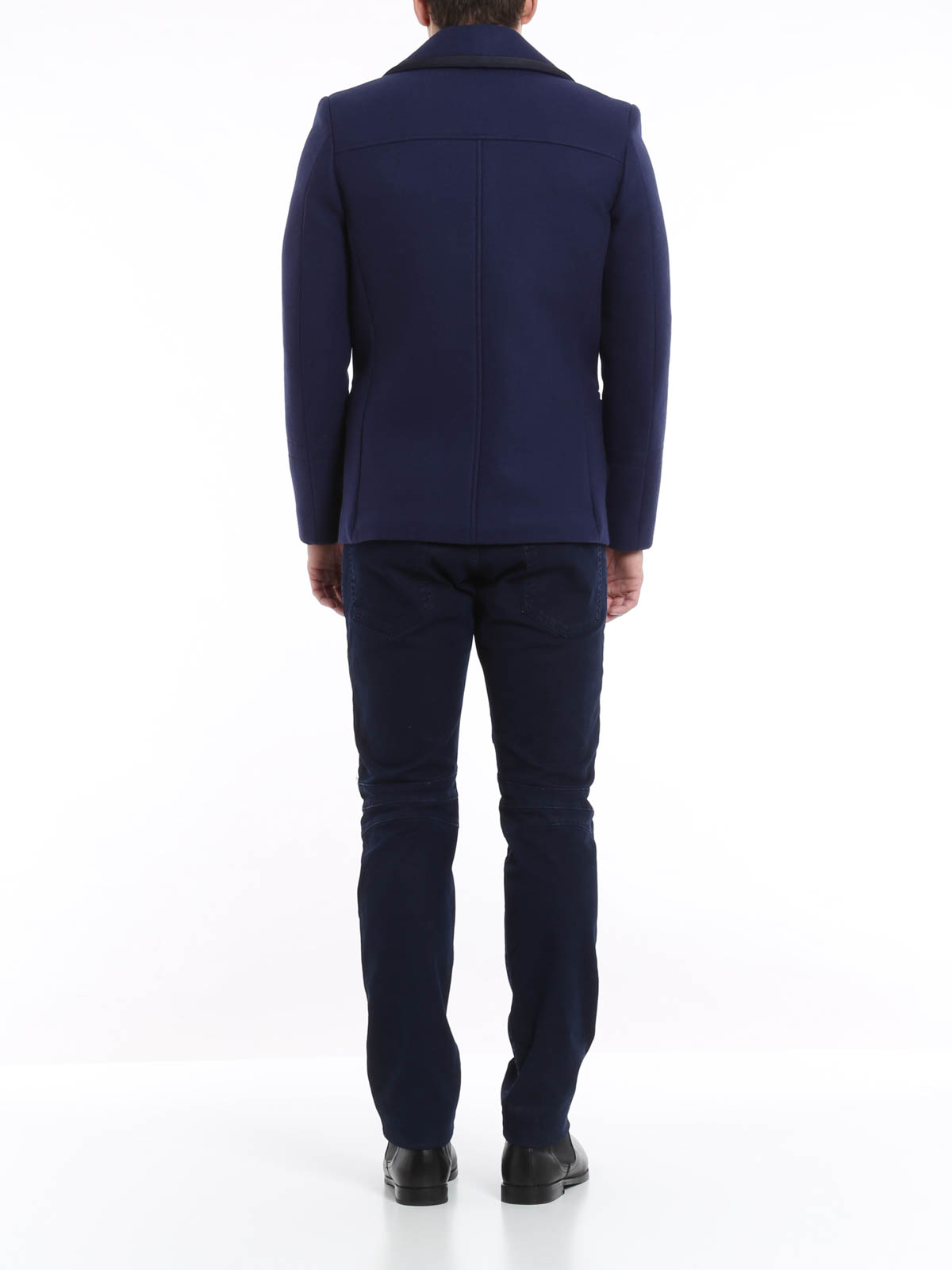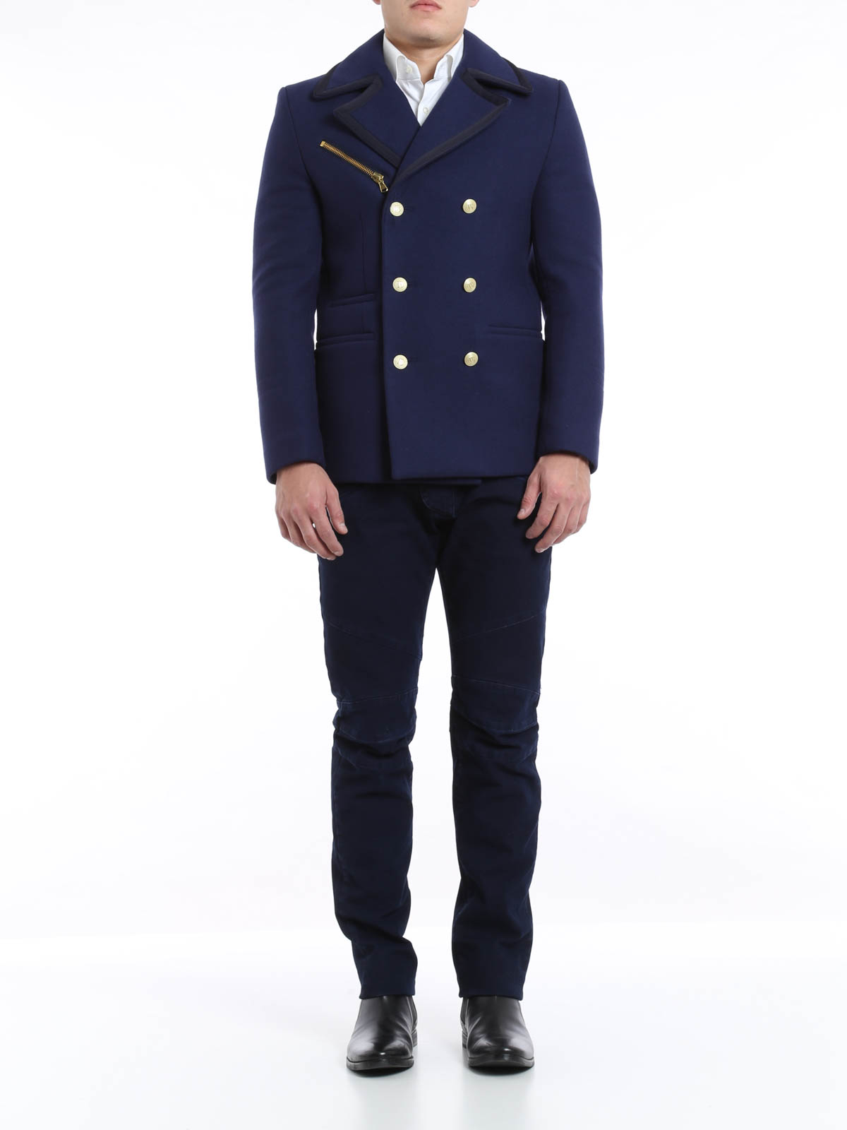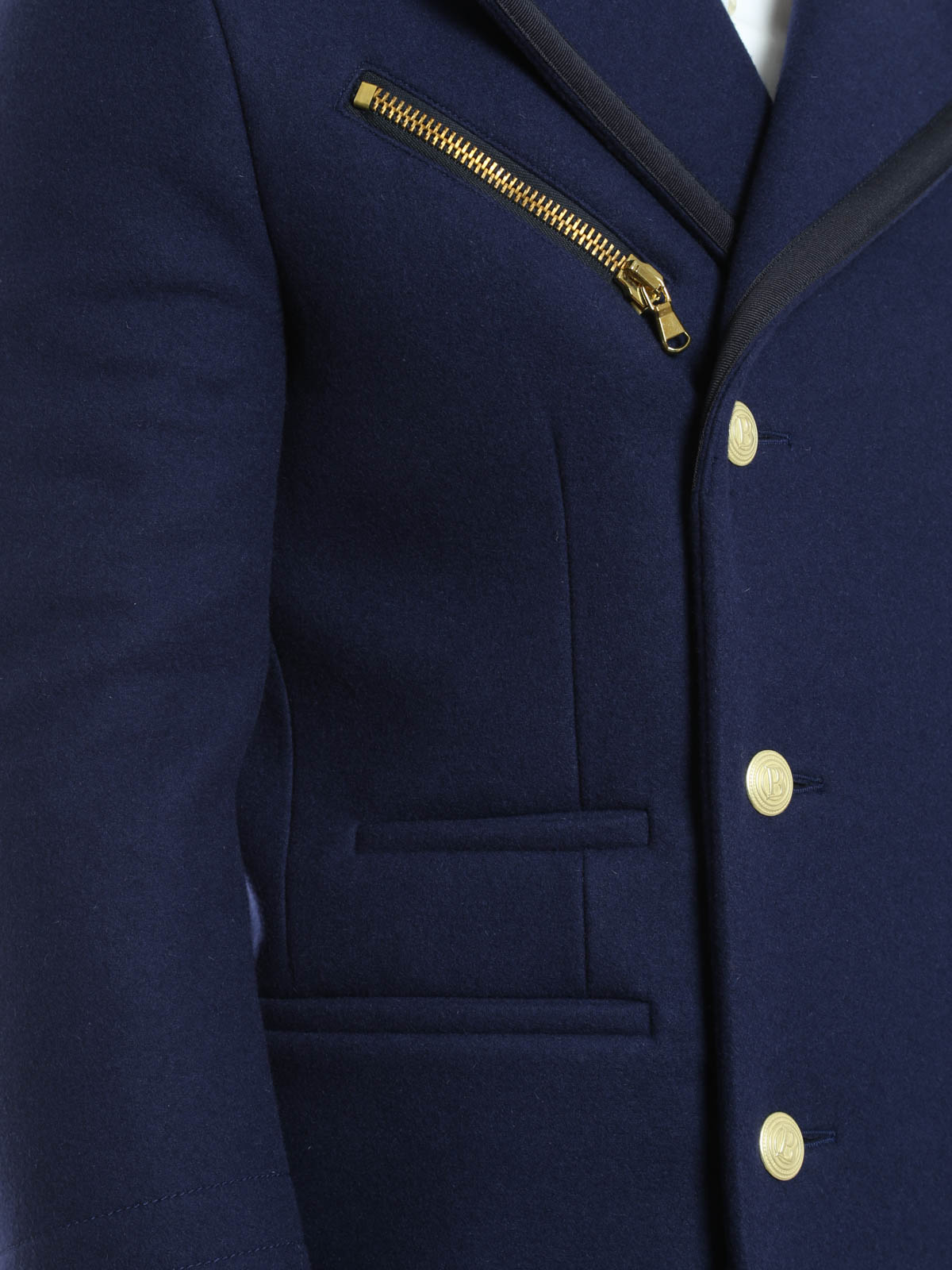 Double-breasted jacket realized in wool with tonal fabric hems, featuring metal button fastening and two side pockets. Asymmetric zip pocket on front. Internal lining with Pierre Balmain signature.