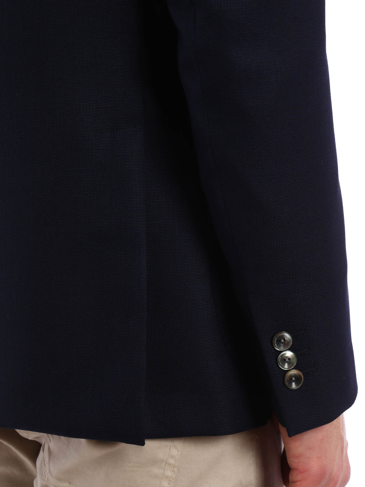 Unlined wool jacket featuring a single-breast three button front, notched lapels, two patch pockets and a single breast pocket, rear double vent, lined sleeves and buttoned cuffs. Mother-of-pearl buttons.