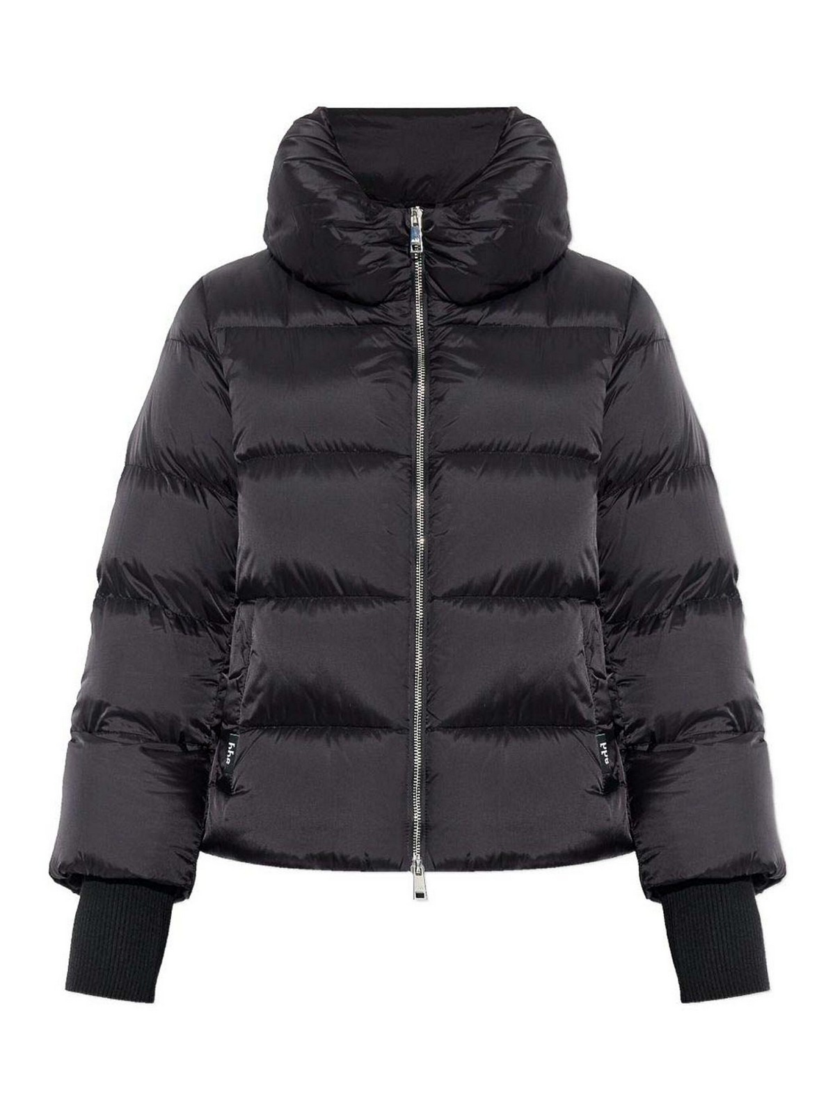Features black funnel neck with zip ribbed cuffs quilted design
