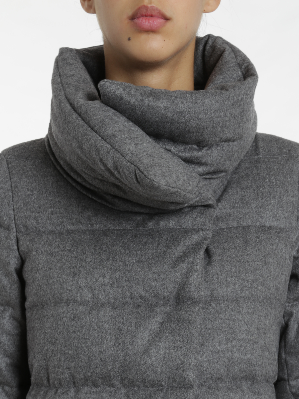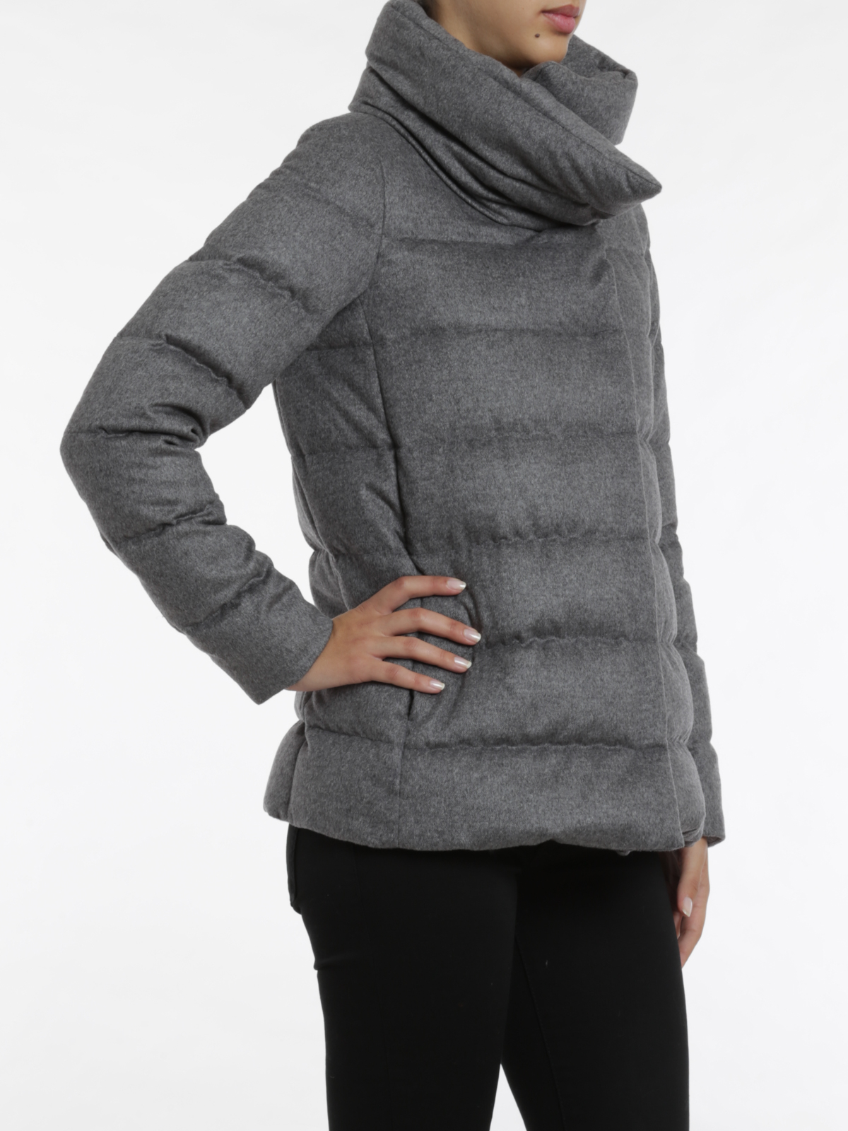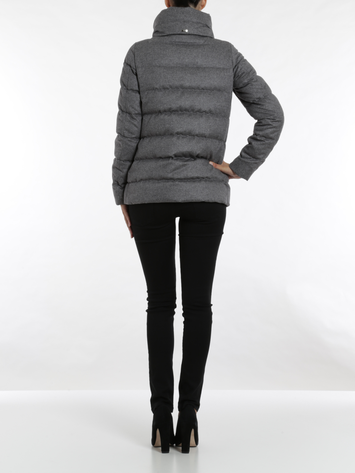 Short down jacket with wool shell.Dropglide water-repellent treatment.Snap button fastening, turtleneck and side welt pockets. High-tech fabric lining with ultralight and insulating goose down padding.