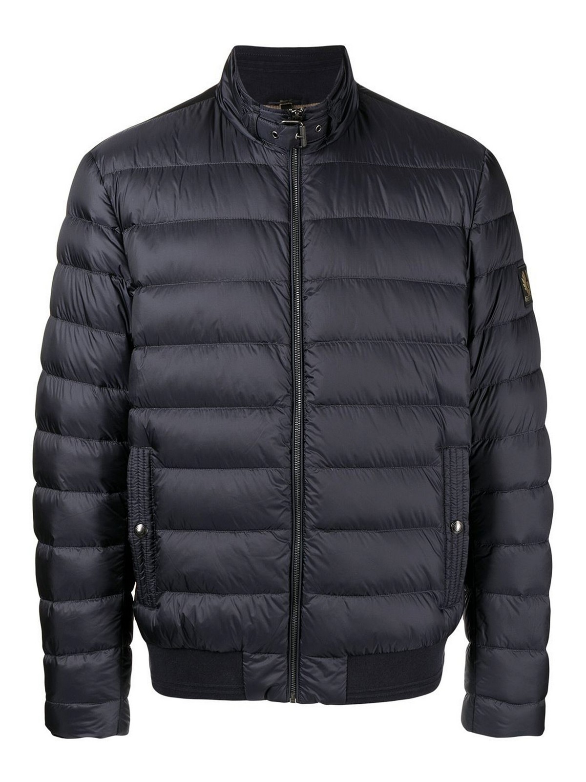 Down-padded puffer jacket from belstaff featuring navy blue padded design logo patch at the sleeve band collar front zip fastening long sleeves straight hem and two press-stud fastening side pockets
