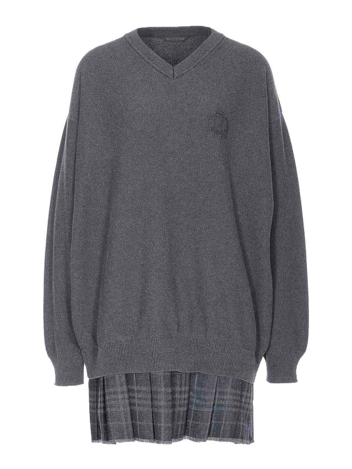 Balenciaga grey layered dress, crewneck, v-neck, embroidered logo on the front, long sleeves, mini skit with check motif