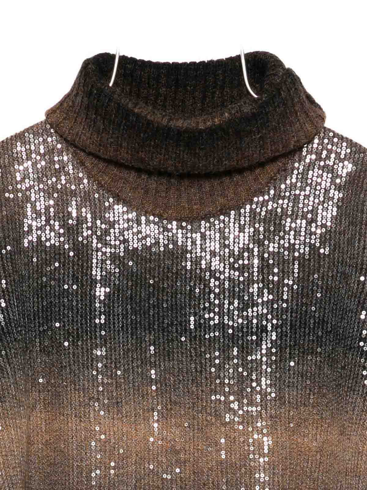 Brown sequin embellishment roll neck short sleeves ribbed knit striped pattern