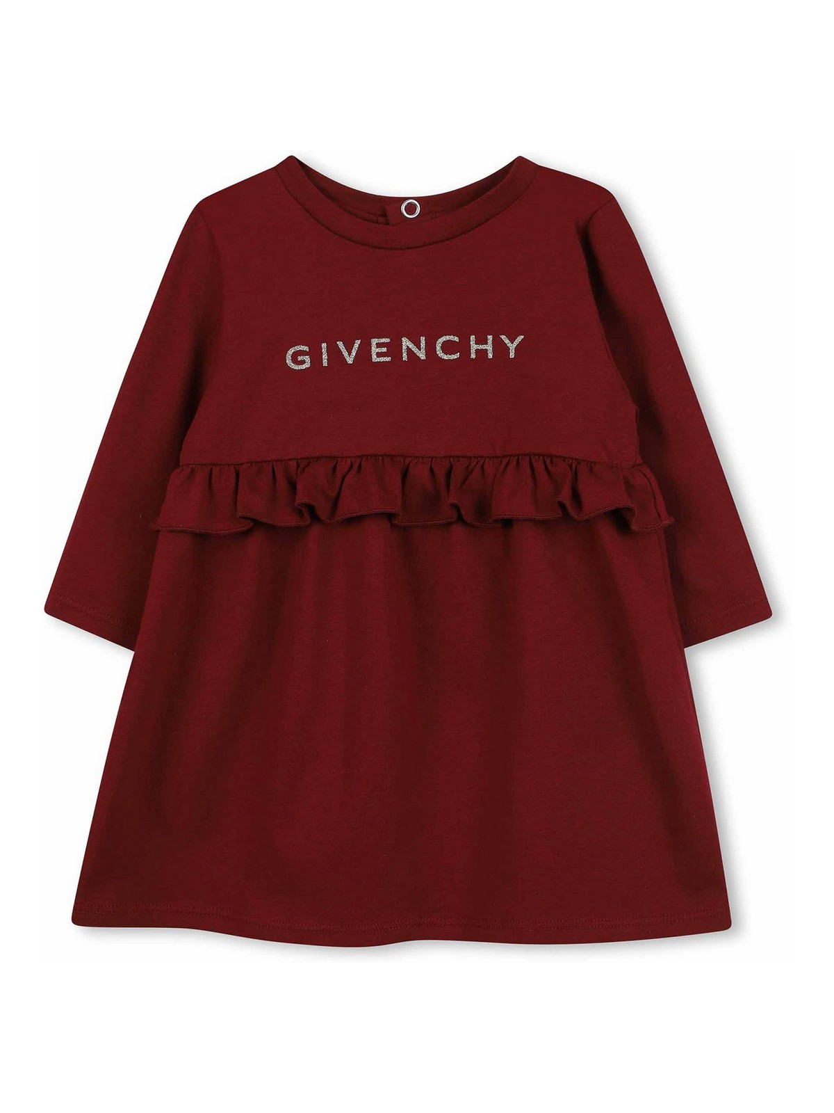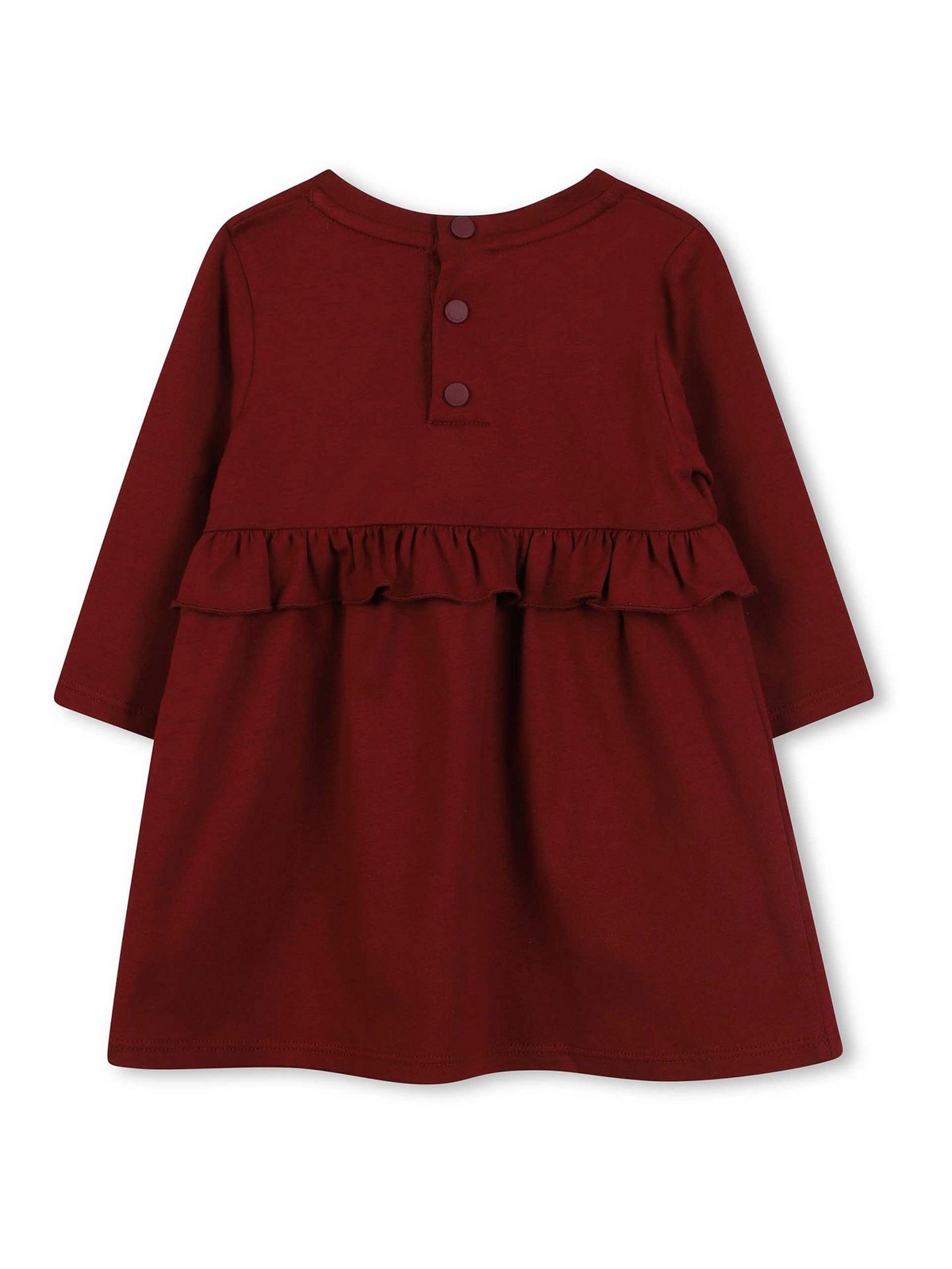 Dress with burgundy logo print with ruffles long sleeves back with organic snap placket %