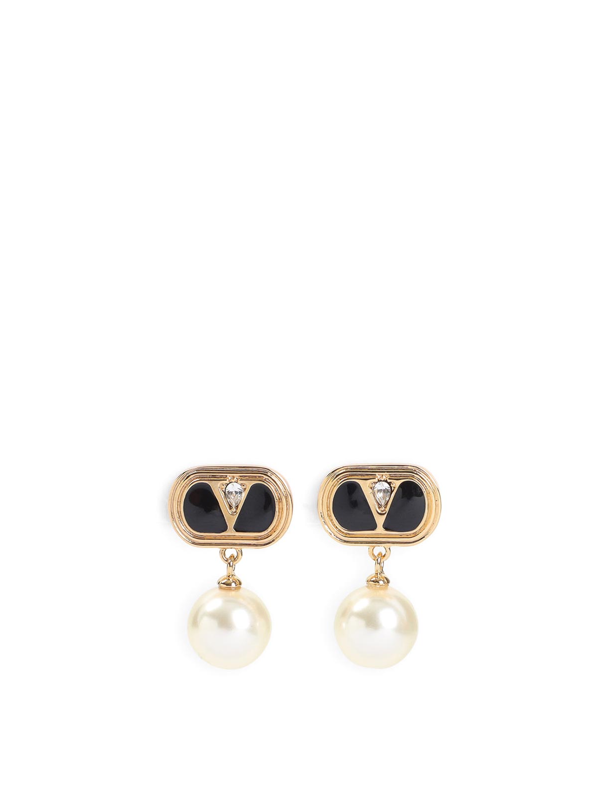 Valentino garavani gold brass earrings. gold-tone brass earrings, top signature v logo, top black detail, top crystal detail, white pearl pendant, back pinned fastening.