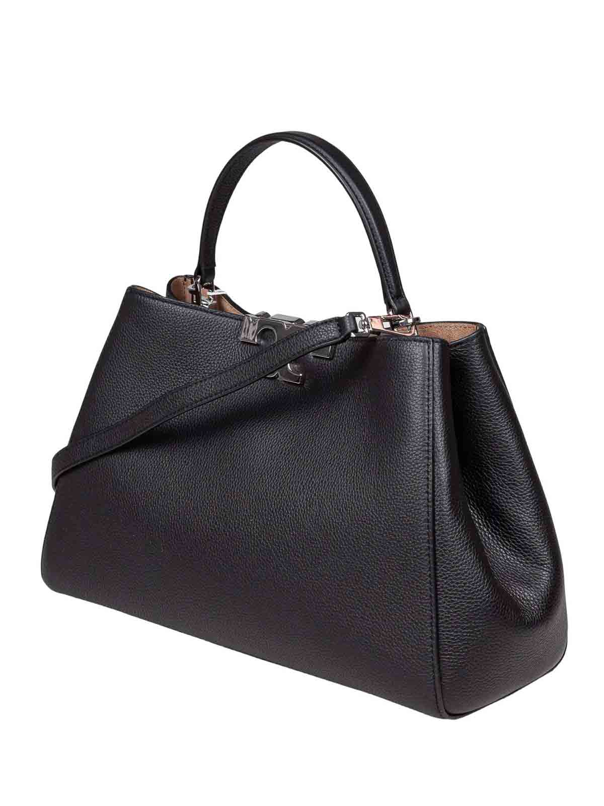 Leather handbag with two handles, one adjustable and removable top with magnetic logo, two main compartments, one small central pocket