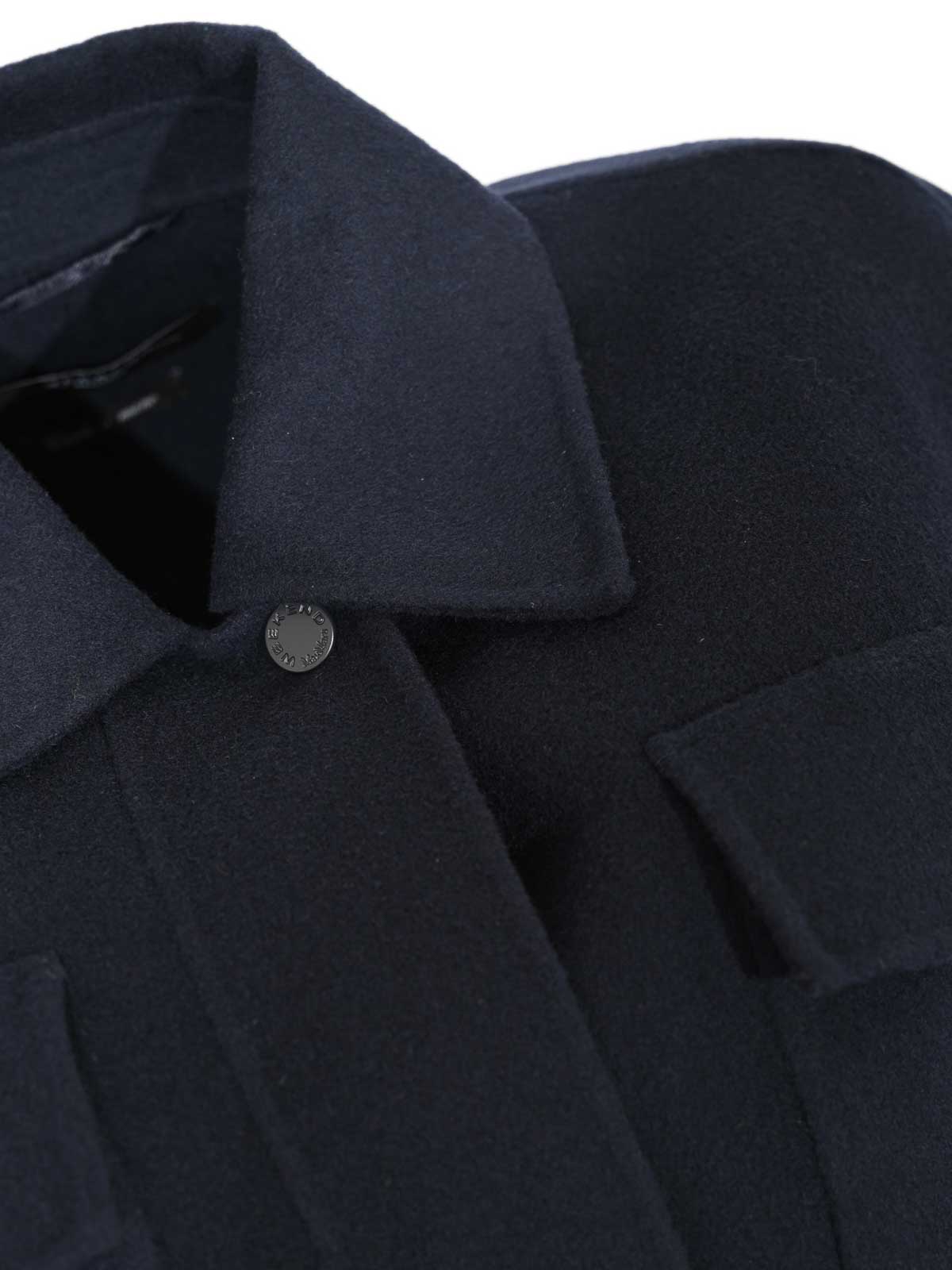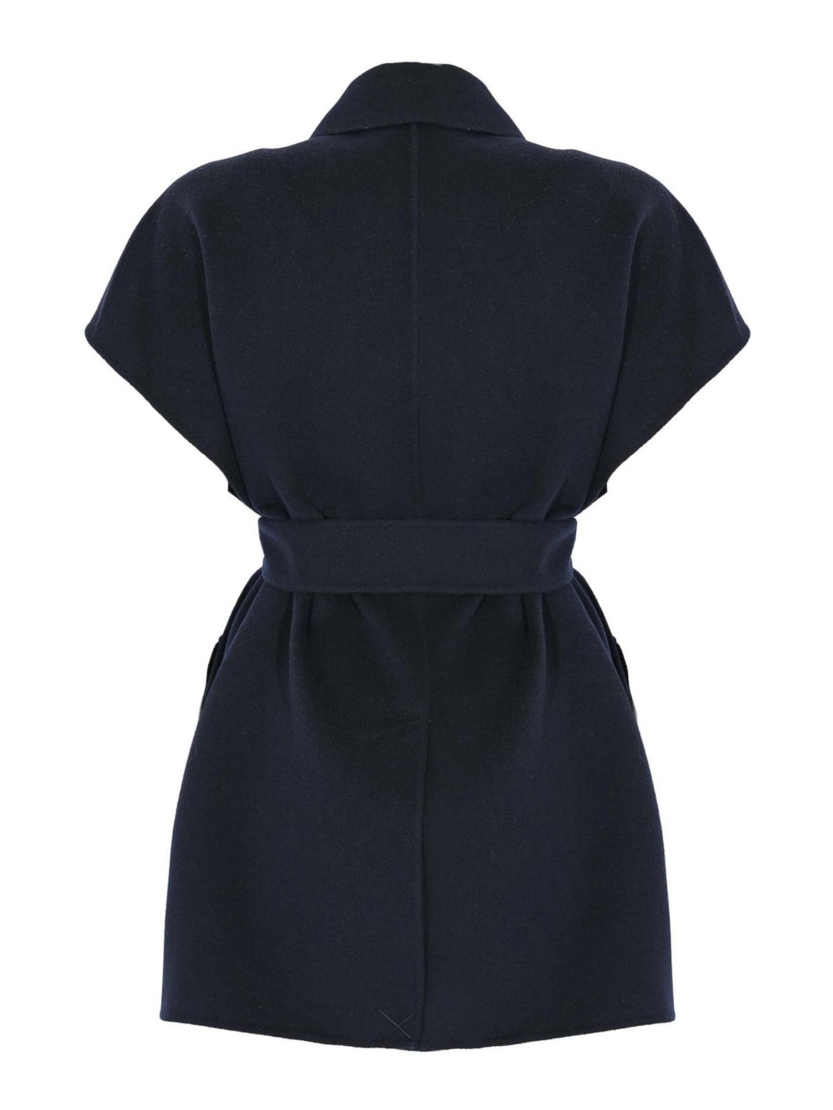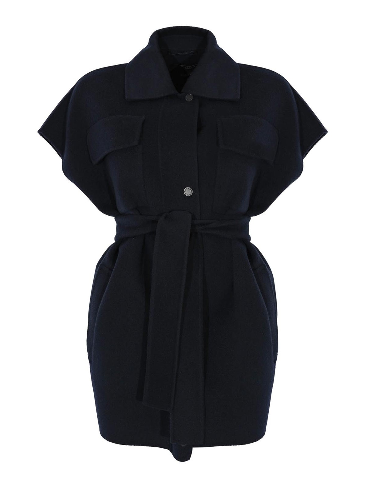 Wool blend jacket elegia model blend pattern plain blue sleeves sleeveless wide shoulder cut collar classic with lapels hidden snaps on the pockets two patch pockets on the chest with flaps + inset side pockets matching belt to accentuate the waist logo buttons flared hem lined no fit relaxed adjustable with belt