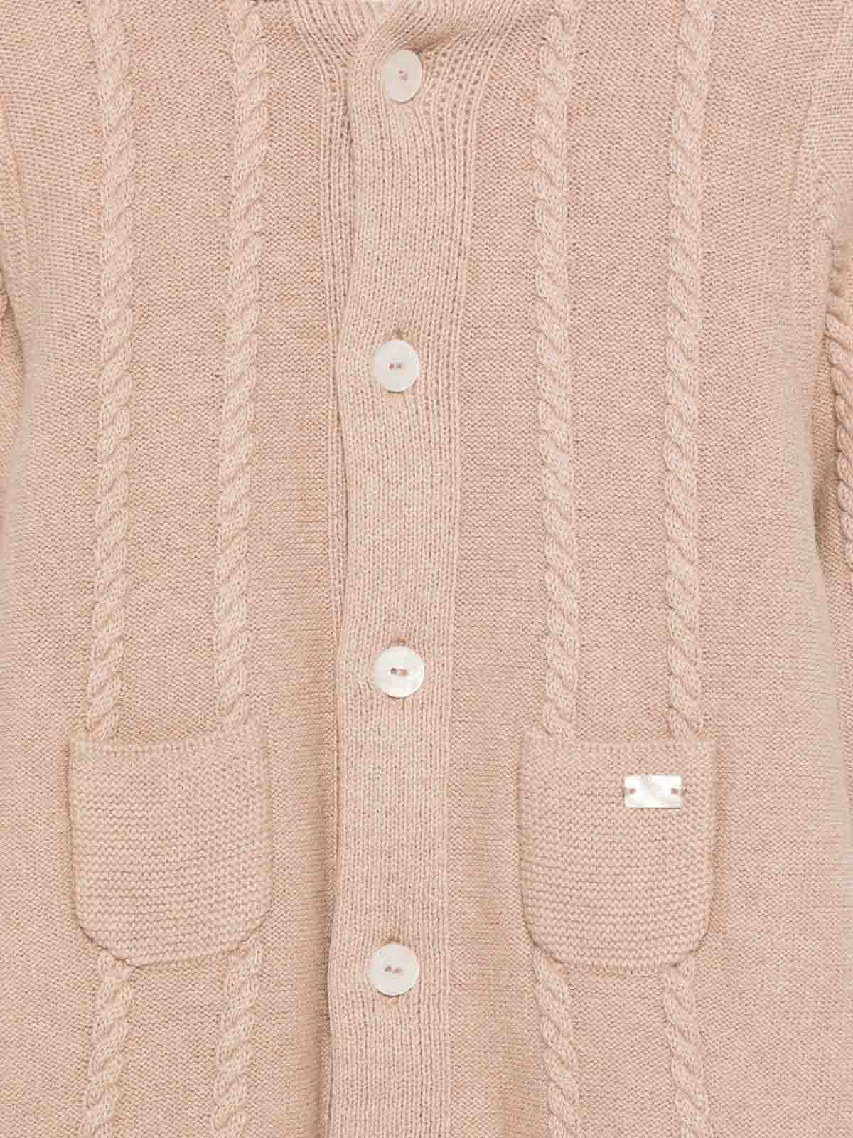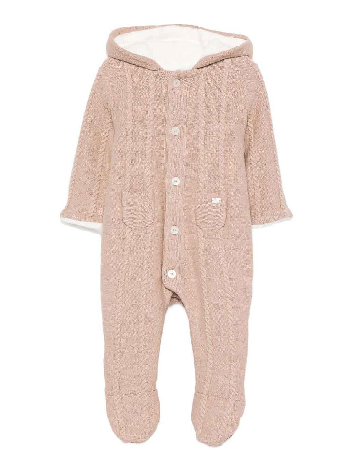 Eskimo with hood features beige cable knit with buttons, fleece patch pockets