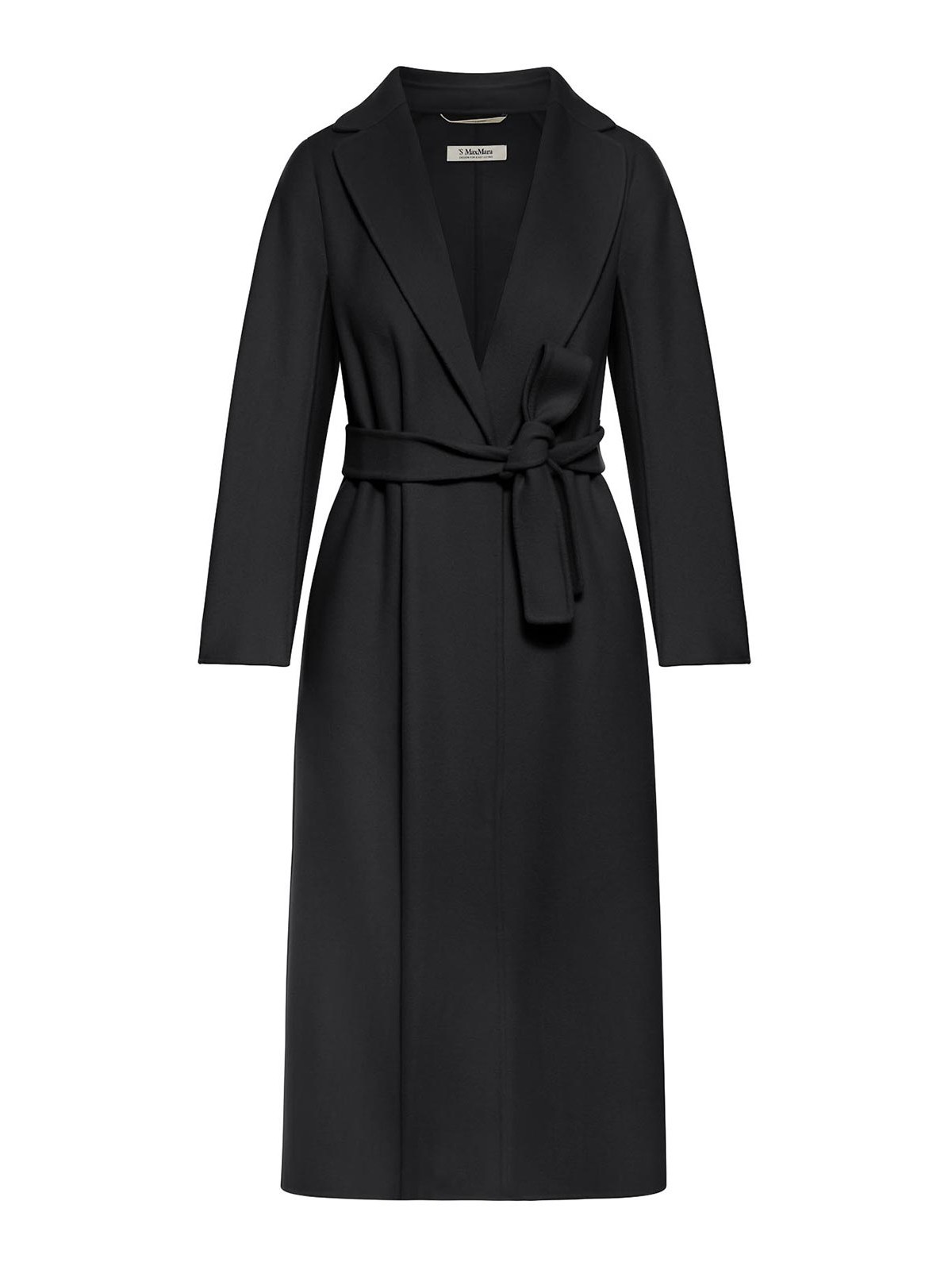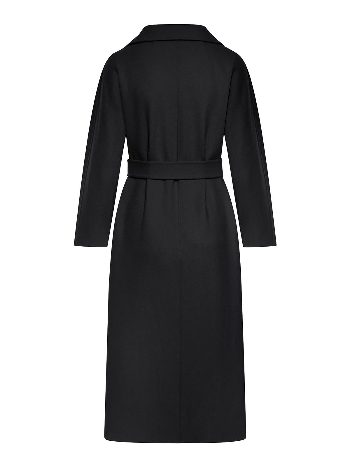 Midi wrap coat with a straight line slightly flared at the hem, hand, sewn double pure, unlined construction, small lapel collar, pockets inserted into the sides, kimono sleeves, matching belt, color black