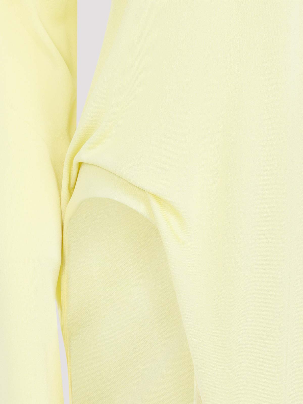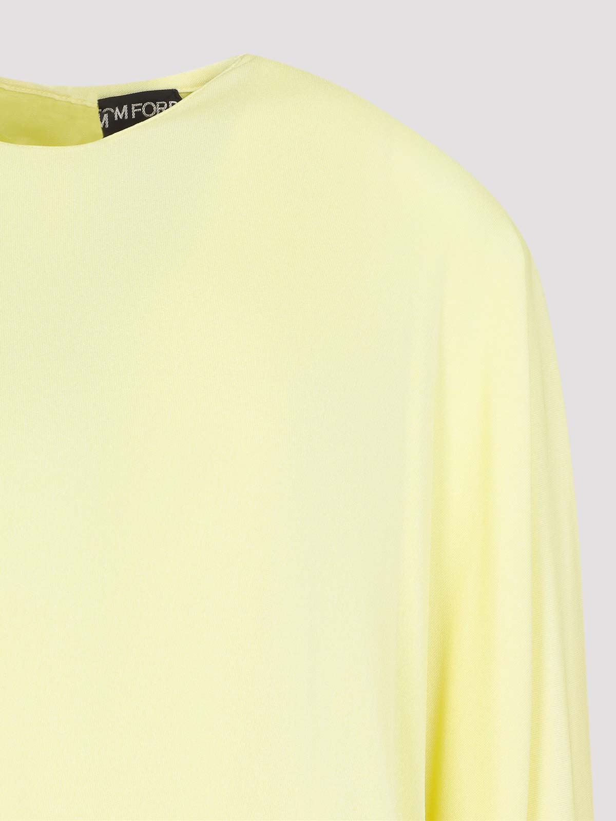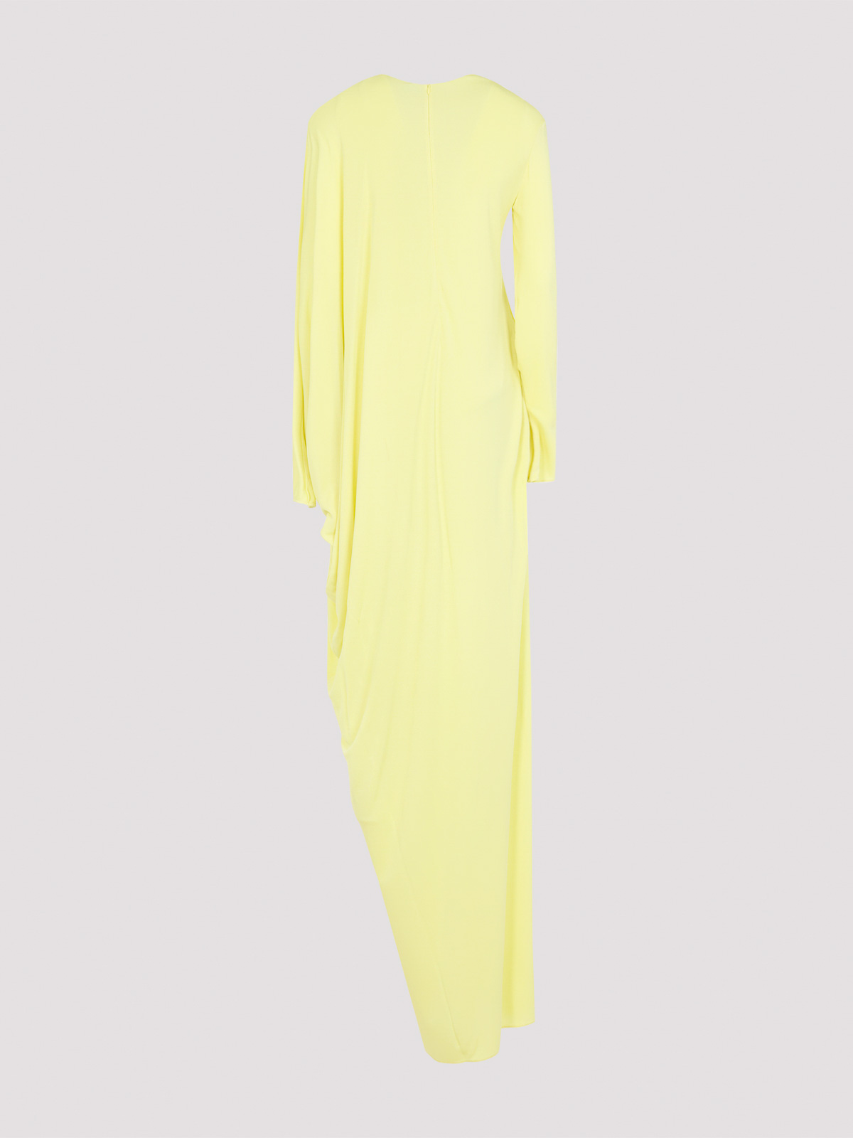 Tom ford cream yellow evening dress crafted round neck back zipped long sleeves bell, shaped left side draped design side slit asymmetric hem bodysuit crafted and blend