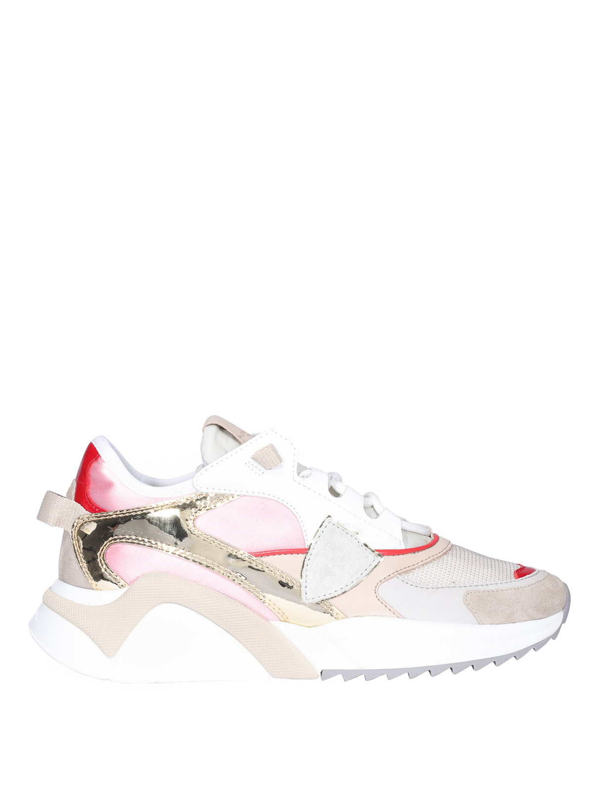 Leather, pvc and nylon sneakers featuring mirror leather and fluo details, two-tone trekking inspired laces and oversized rubber sole.