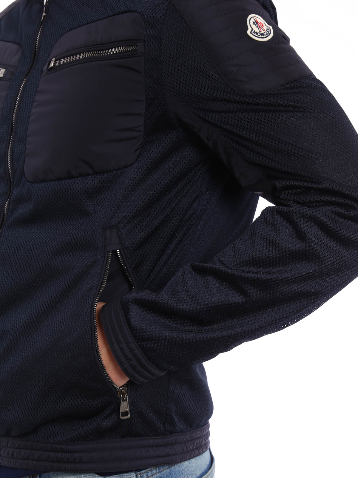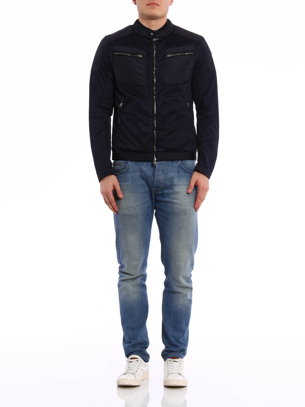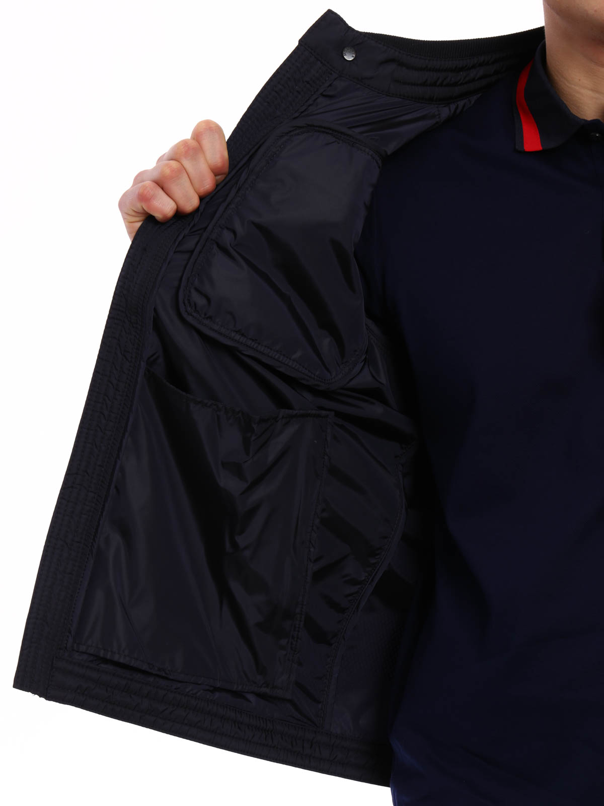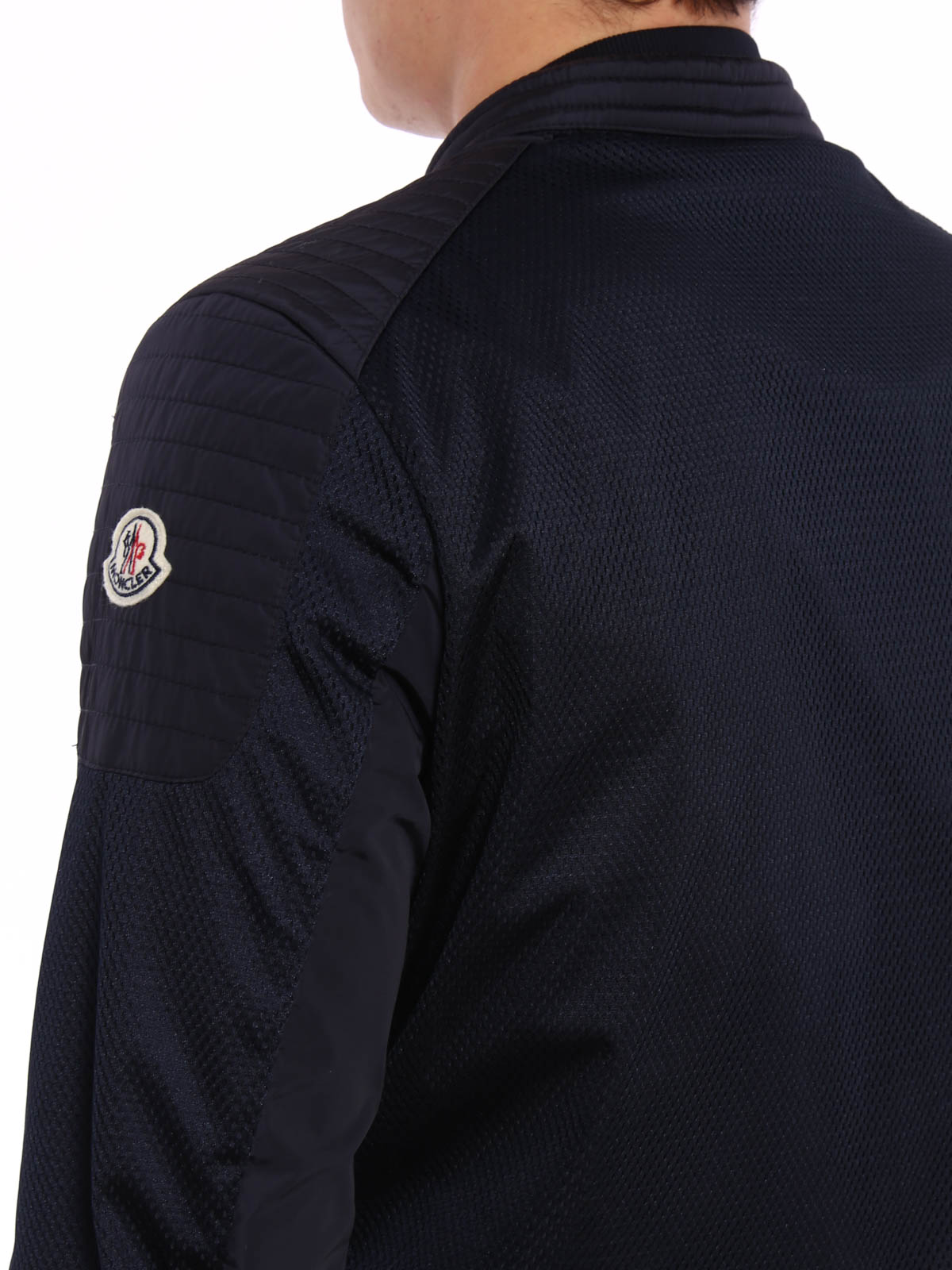 Waterproof technical fabric jacket covered by tonal mesh detailed with padded round neck with snap fastening and rib-knit insert, biker-inspired padded shoulders, snap cuffs, four front zip pockets and double-slider zip fastening.