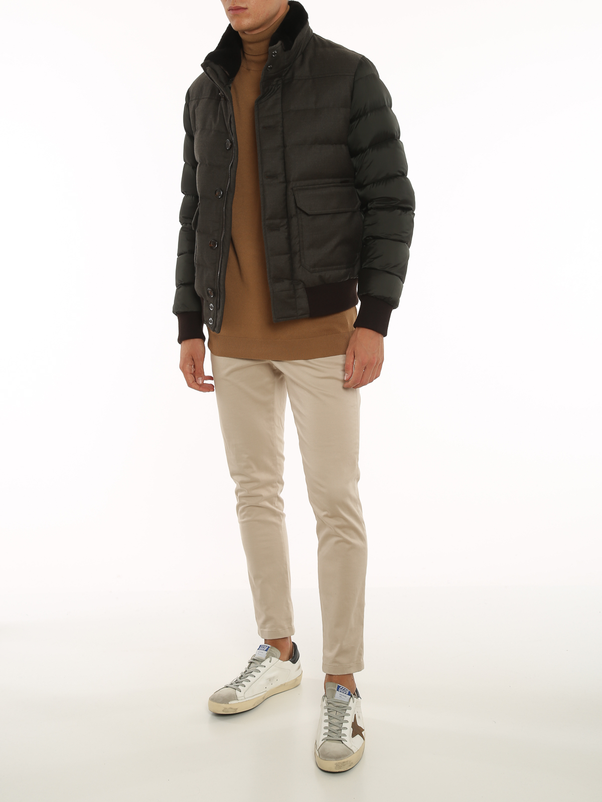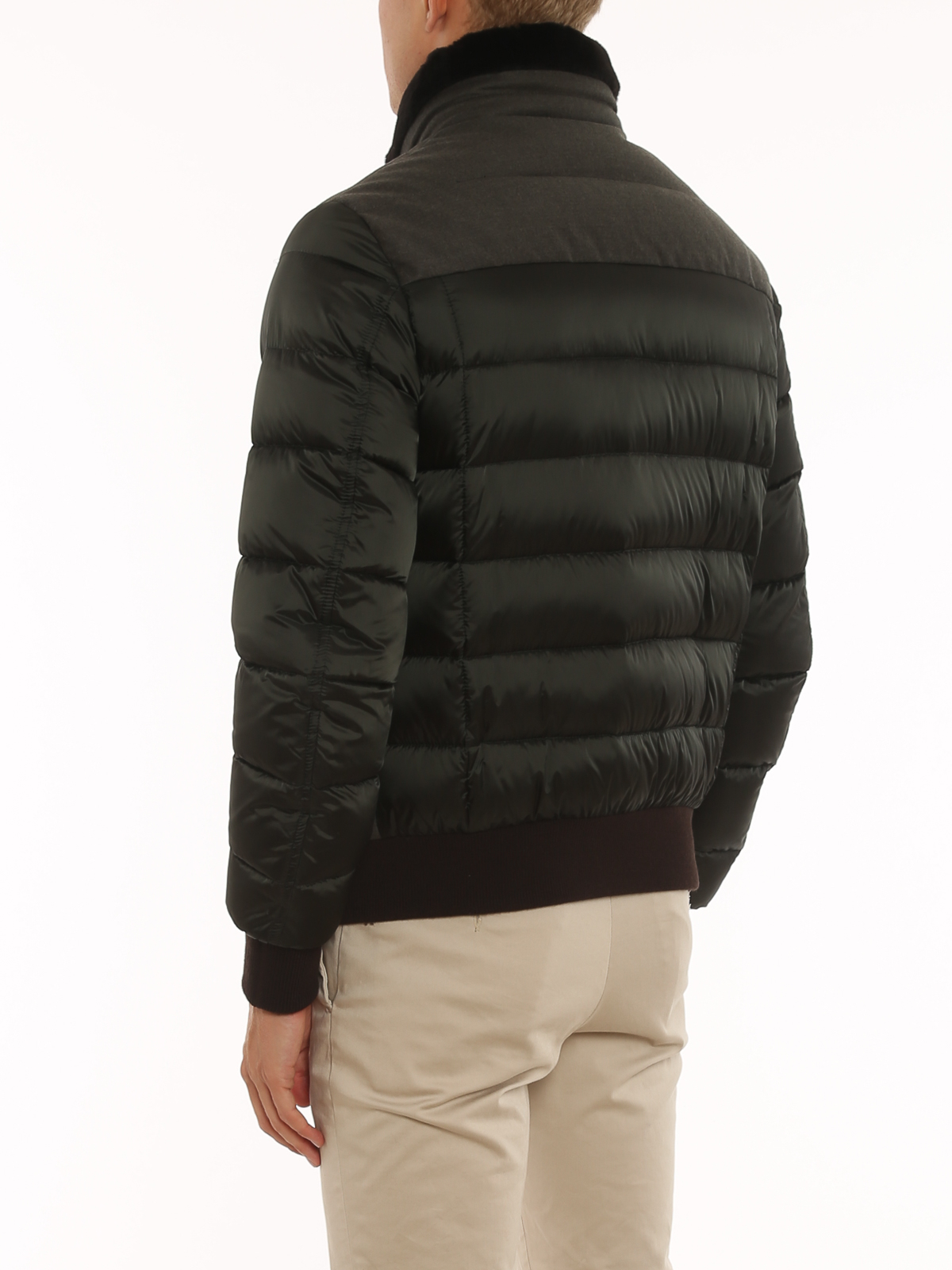 Tech fabric puffer jacket featuring button and concealed zip fastening. Thermal Index: -25°/+15° C.