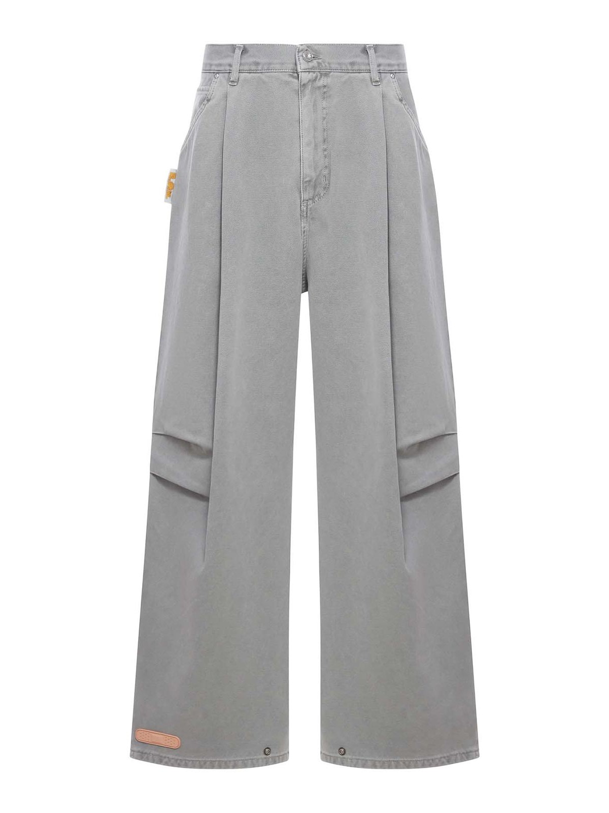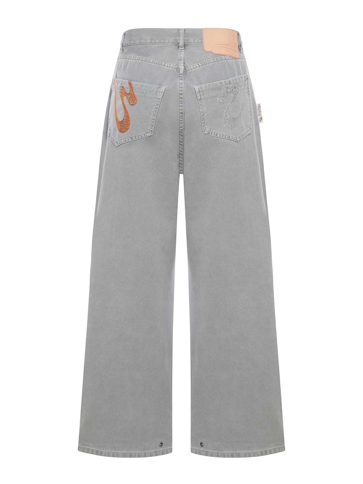 Belt loops at the waist, zip and button, stitched pleat along the leg, pockets, patch on the back, custom back pockets, custom hardware on the and back, straight wide leg, - color grey
