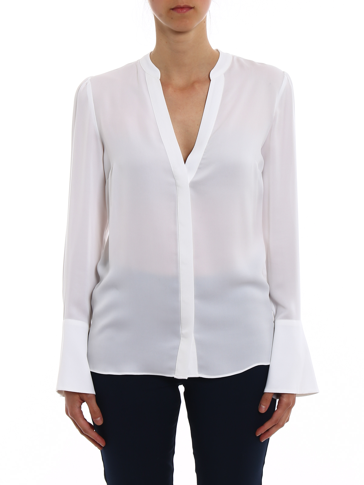 Pure silk shirt featuring V-neck, concealed button placket and flared cuffs with two small gold-tone buttons.