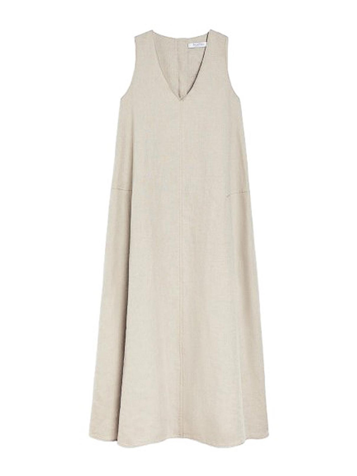 Long sleeveless dress in pure linen canvas. unlined model, characterized by a flared silhouette with ample volume with a v-neck and vertical welt pockets on the sides. invisible zip closure on the back.