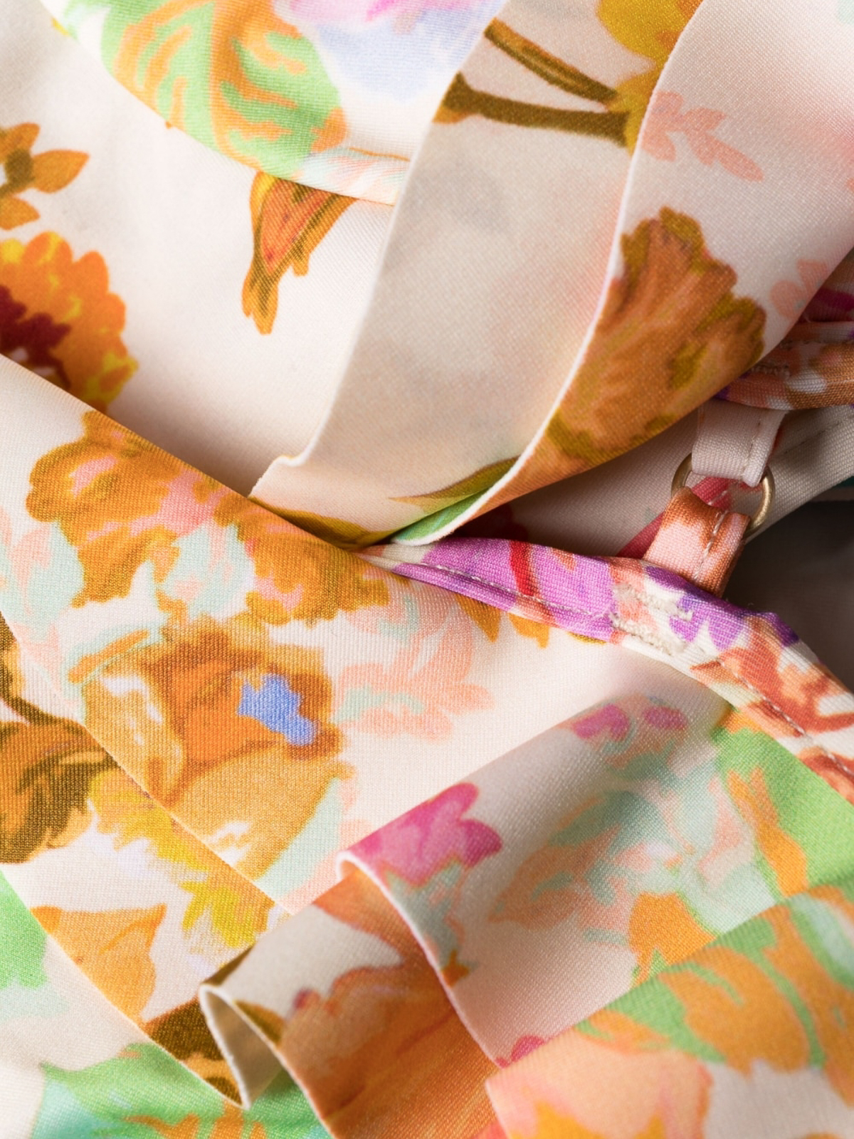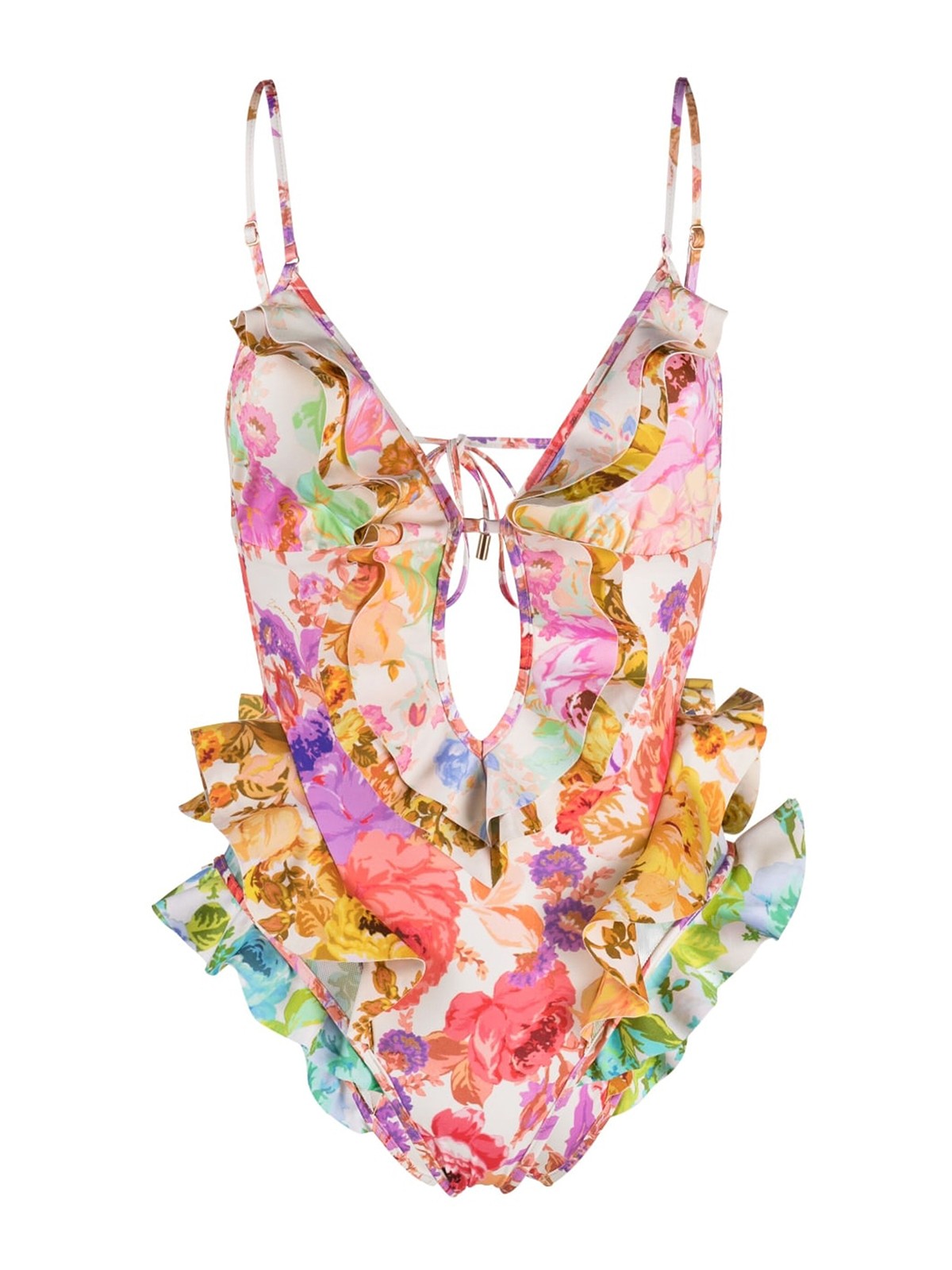 Raie waterfall frilled one-piece from zimmermann featuring multicolour stretch-design all-over floral print ruffled detailing plunging v-neck adjustable shoulder straps and rear tie fastening be mindful to try on swimwear over your own garments