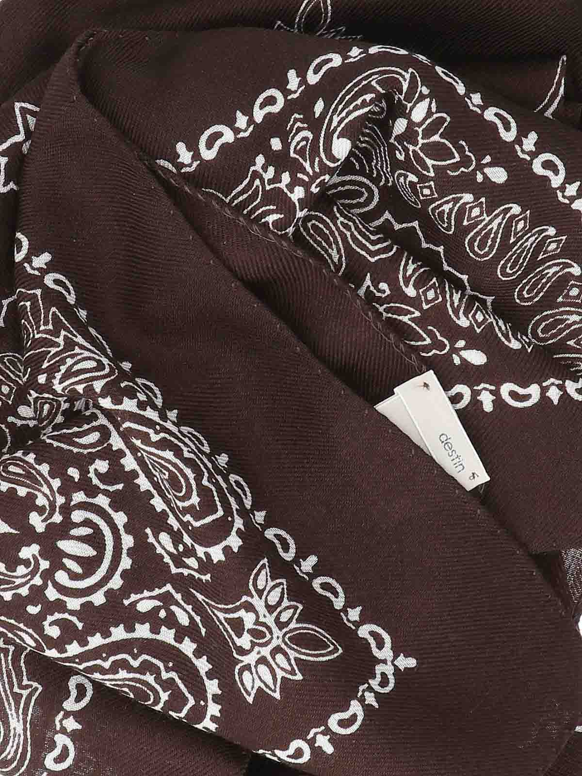 Judy destin scarf, in brown wool, bandana print motif, square shape.