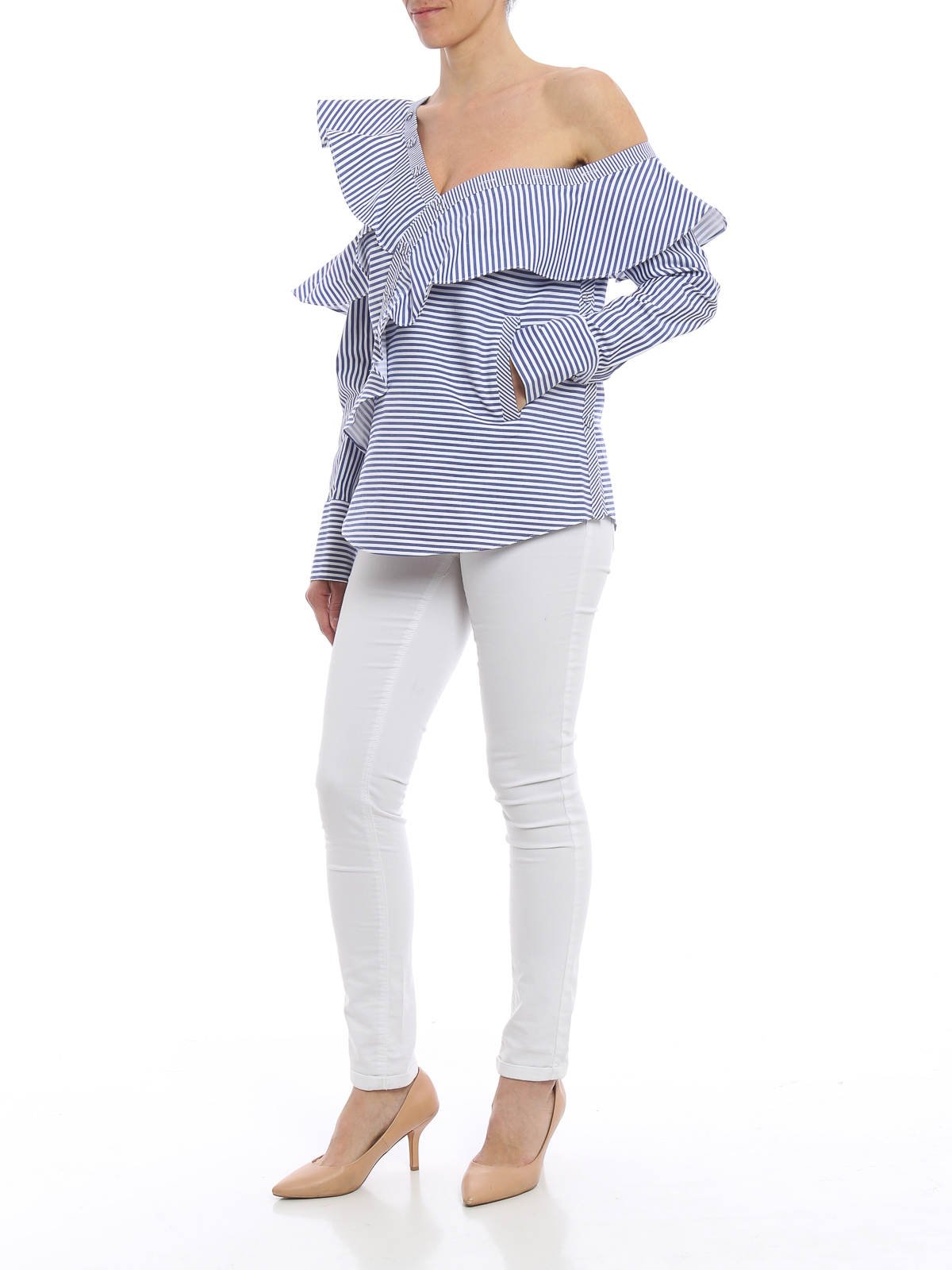 Striped poplin cotton shirt detailed with an asymmetric neckline and frill embellishment, cut out detail on the left shoulder, one welt pocket and buttoned cuffs.