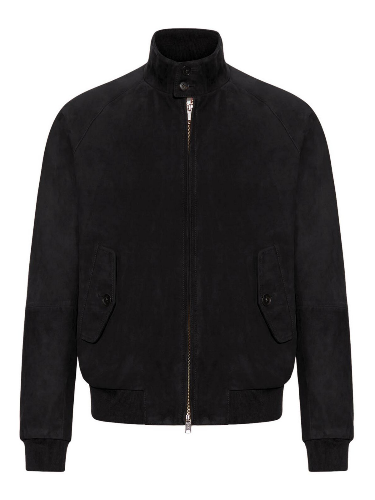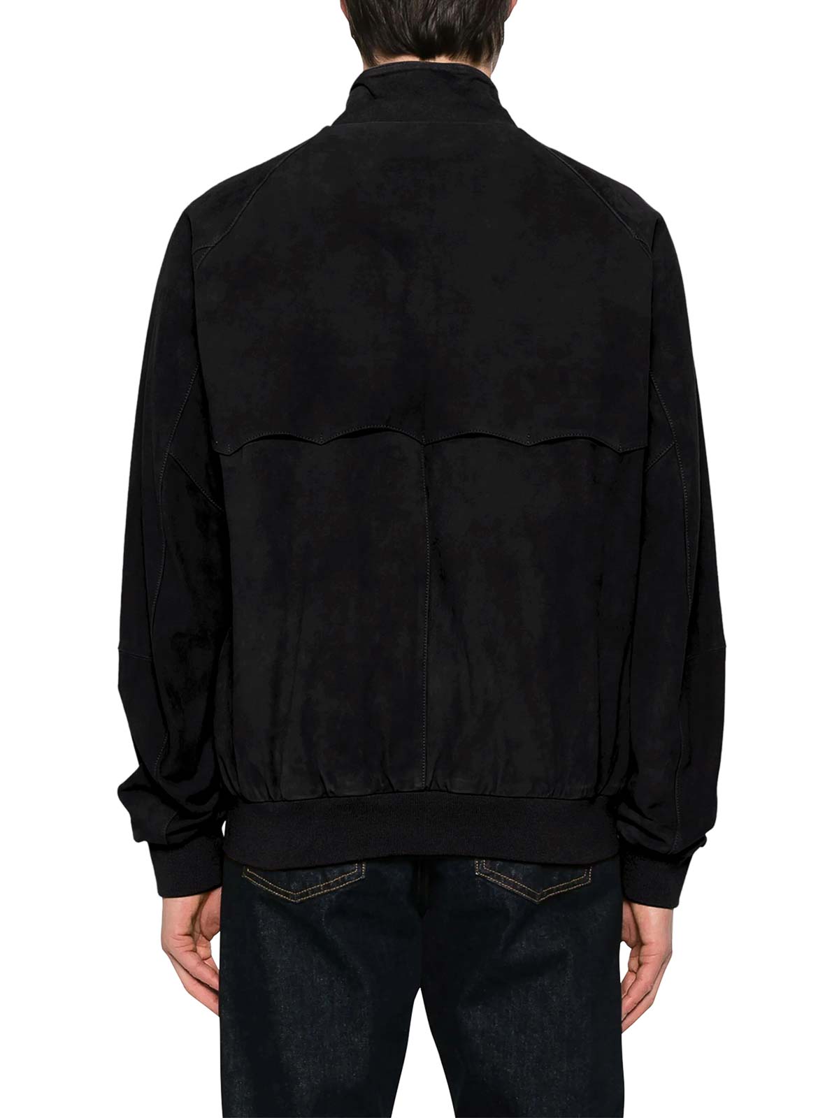 classic harrington jacket in premium suede, breathable fraser tartan lining in coolmax fabric, ribbed inner ear-dog collar with double button closure, slanted side pockets, umbrella back yoke, ribbed cuffs, waistband and collar lining, double-slider logo zip, raglan sleeves for comfort and freedom of movement, front pockets with flap and button, fraser tartan lining, color black