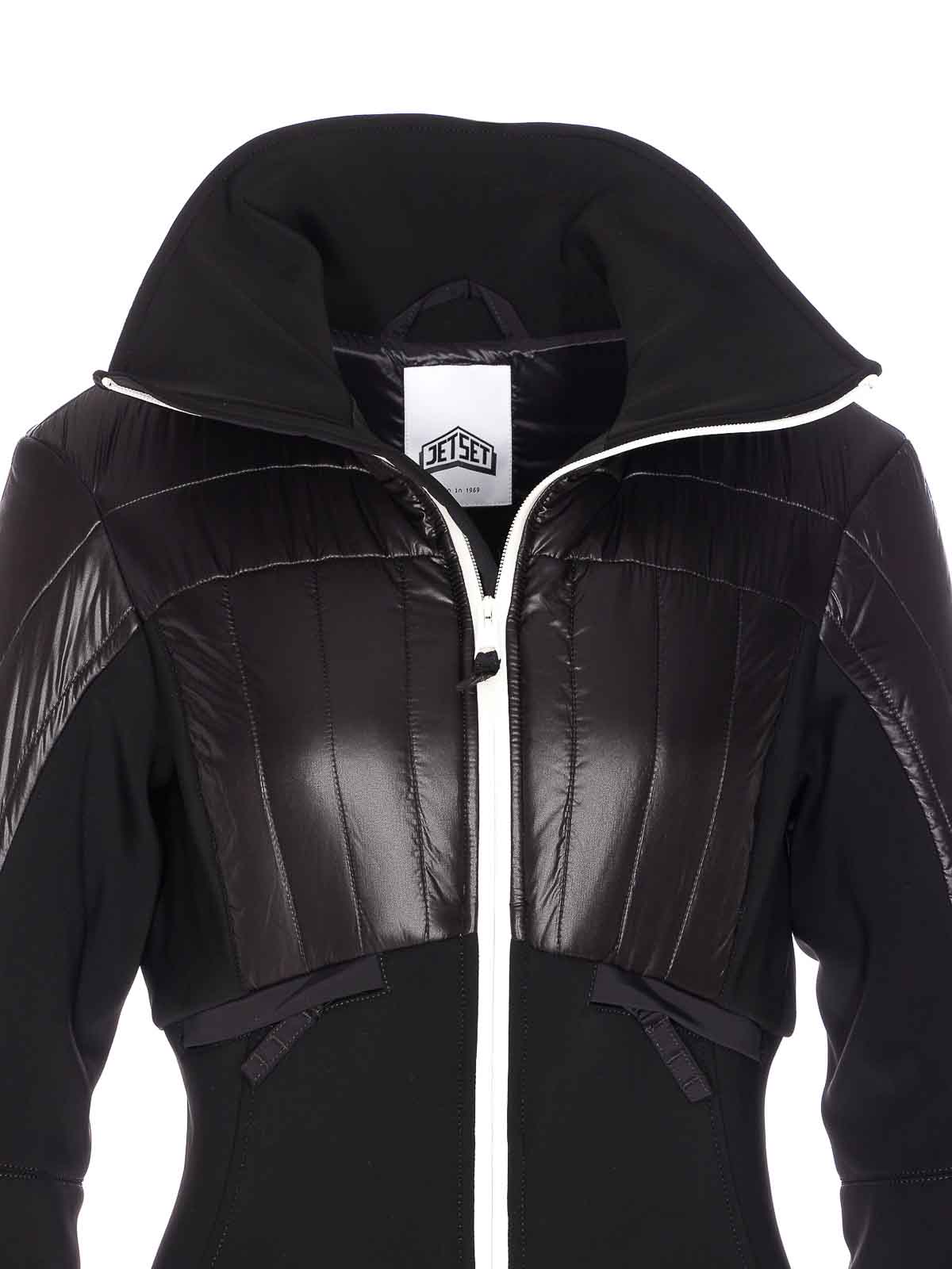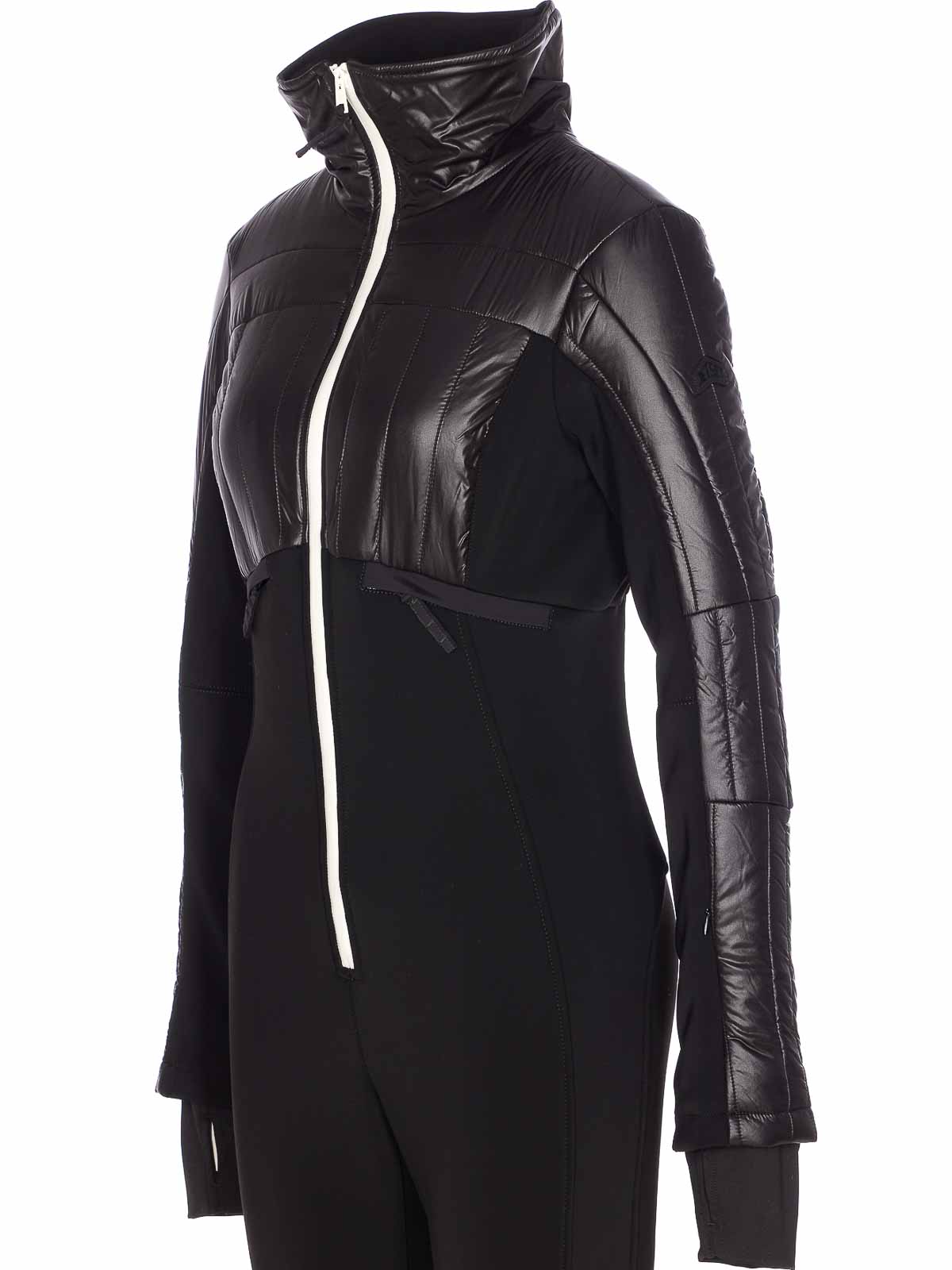 Jet set black gertrude ski suit with zip closure, long sleeves, high neck, long sleeves, padded, zip pocket detail, cuffs