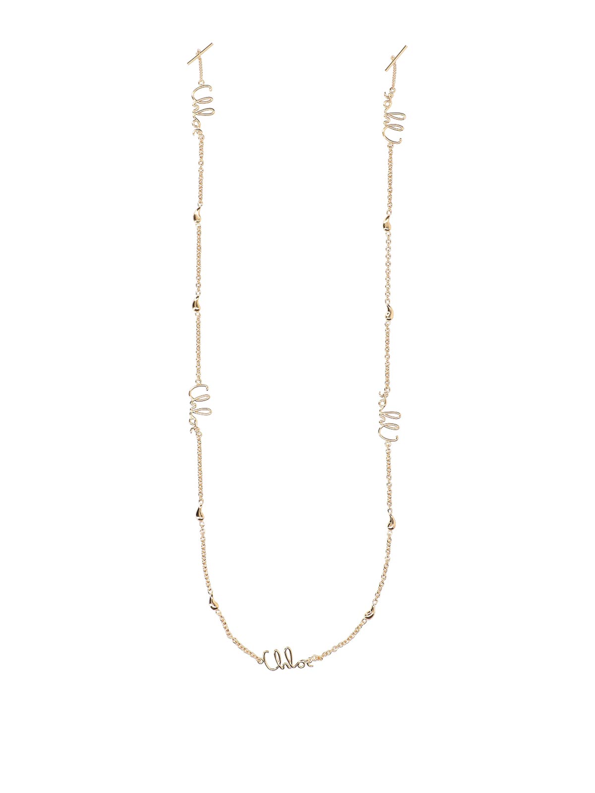 iconic chlo glasses chain, in brass, golden finish, all-over lettering logo details, t-bars on the edge.