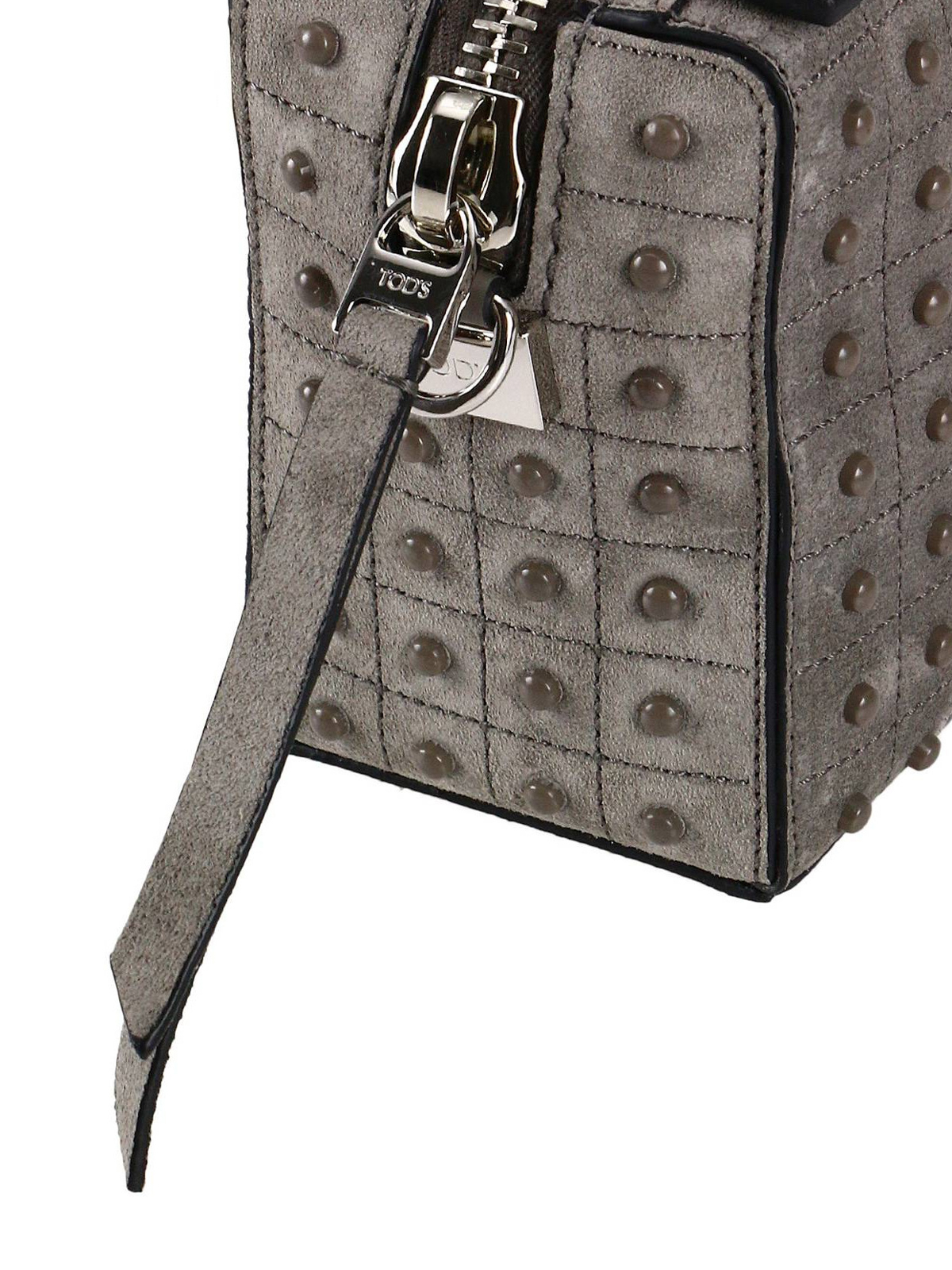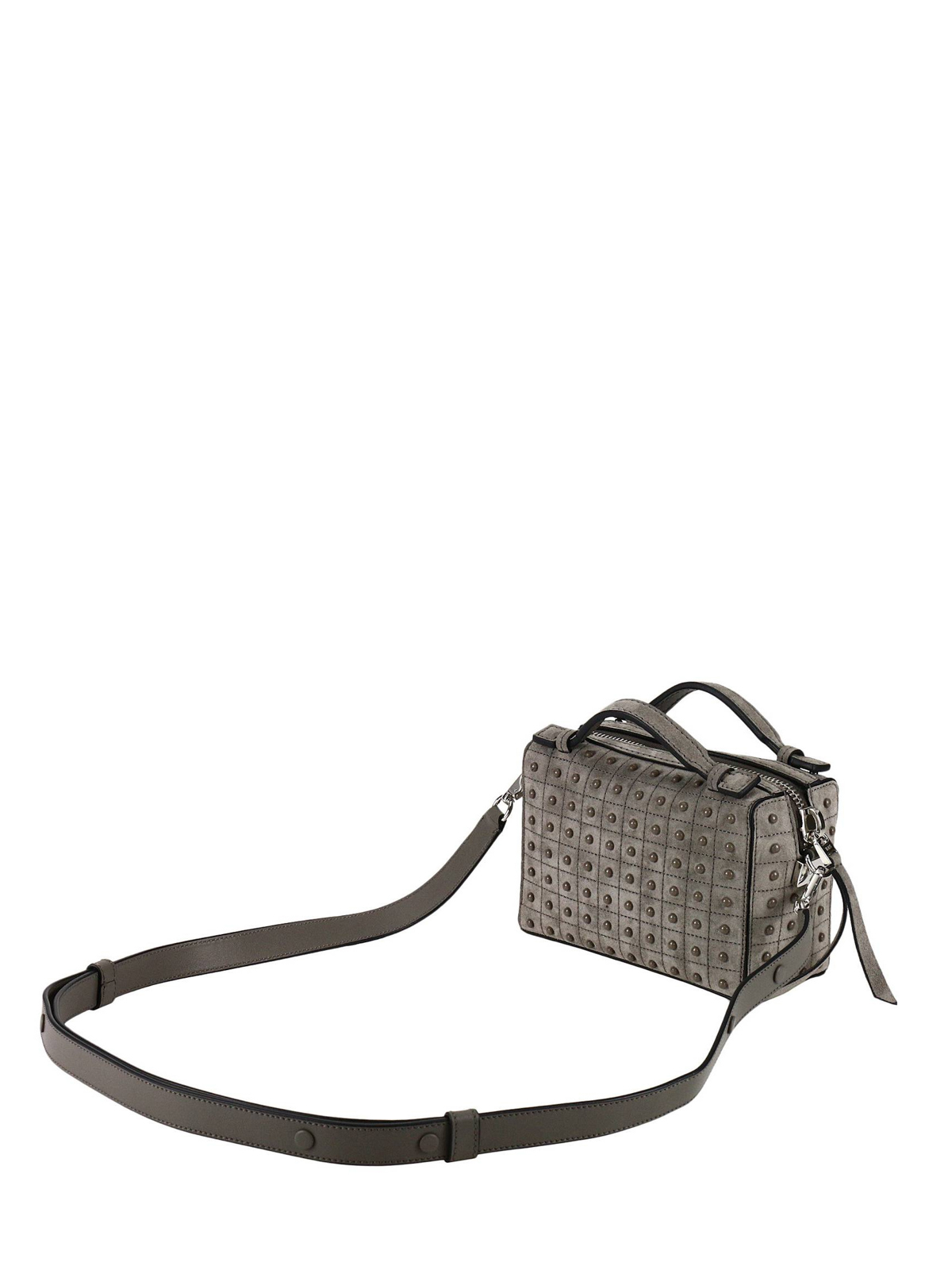 Suede box bowling bag featuring signature pebble all over embellishment, top zip fastening and double flat handles, removable shoulder strap.