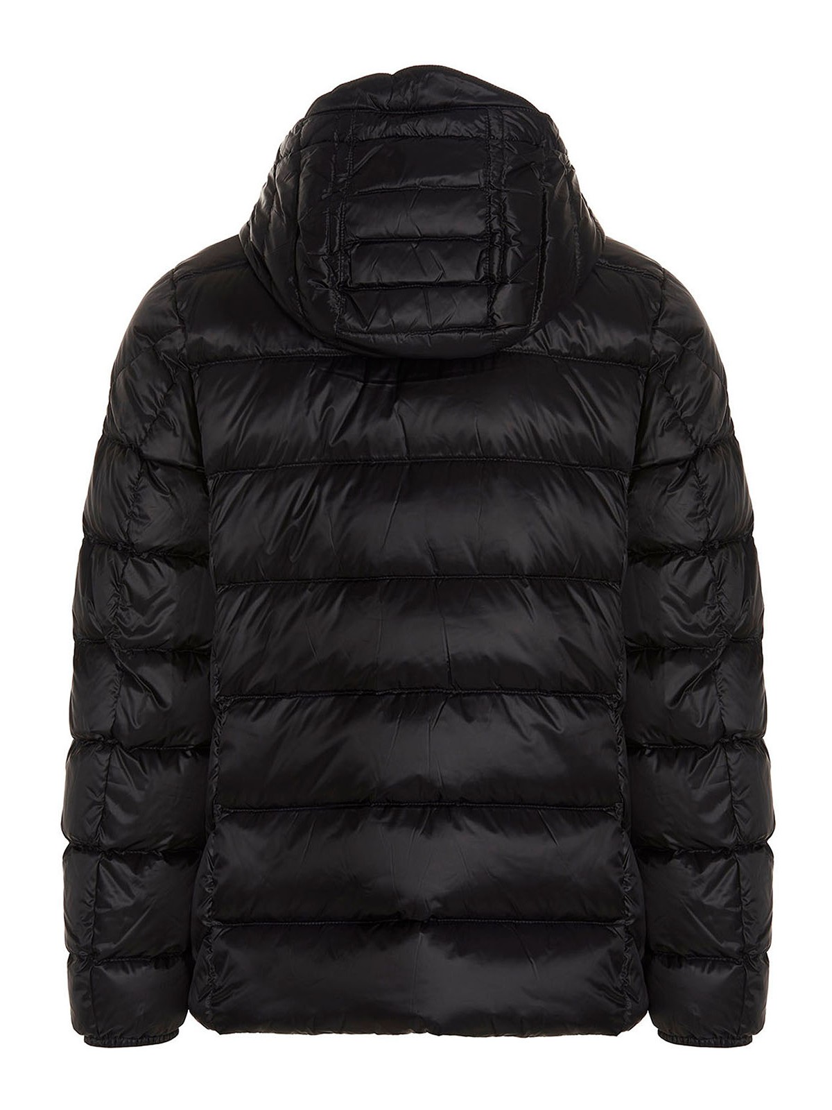 Down jacket with removable hood, duck down padding, zip closure, pockets, long sleeves with elastic on the wrist, drawstring on the bottom hemline, logo patch on the sleeve.