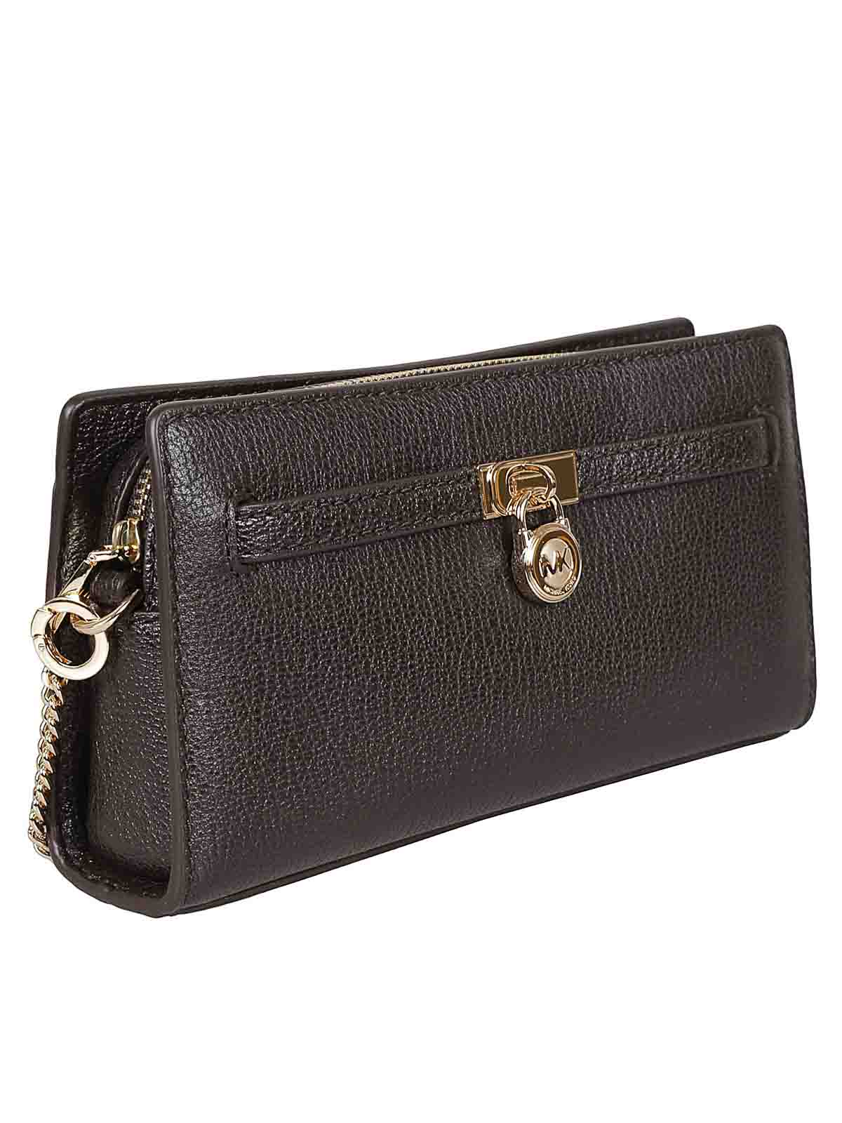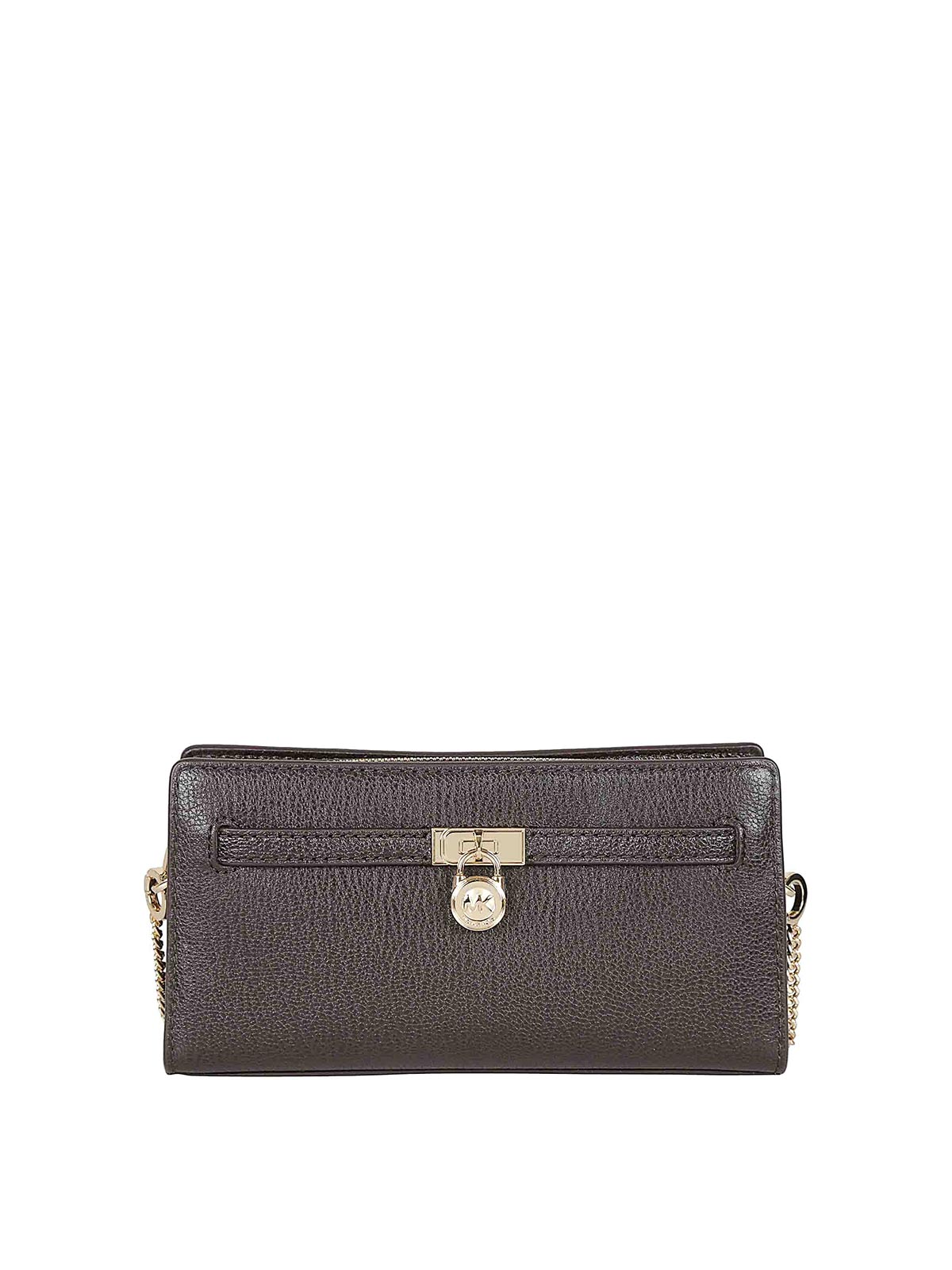 Clutch in chocolate-coloured textured leather, gold-tone metal details, removable and adjustable chain shoulder strap, one external back pocket, zip closure, one internal pocket, case with logo.
