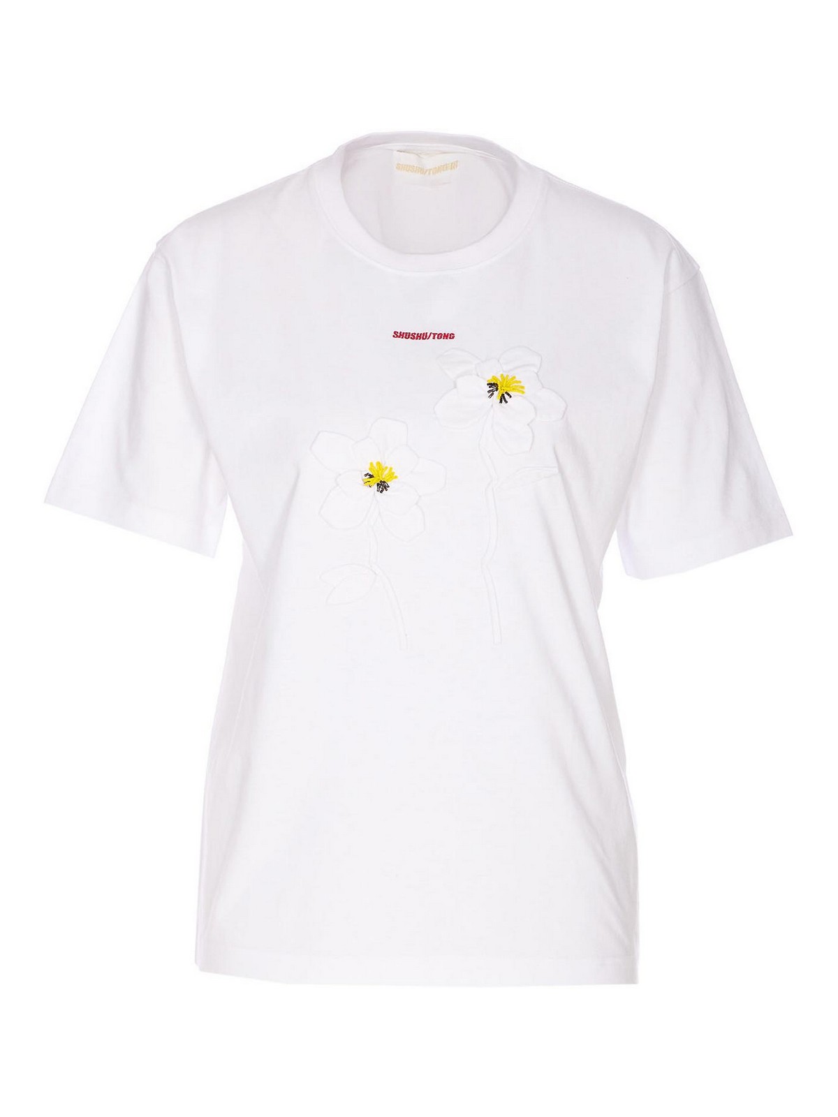 Shushu tong white hand sewn flower t-shirt, crewneck, embroidered logo on the front, application detail