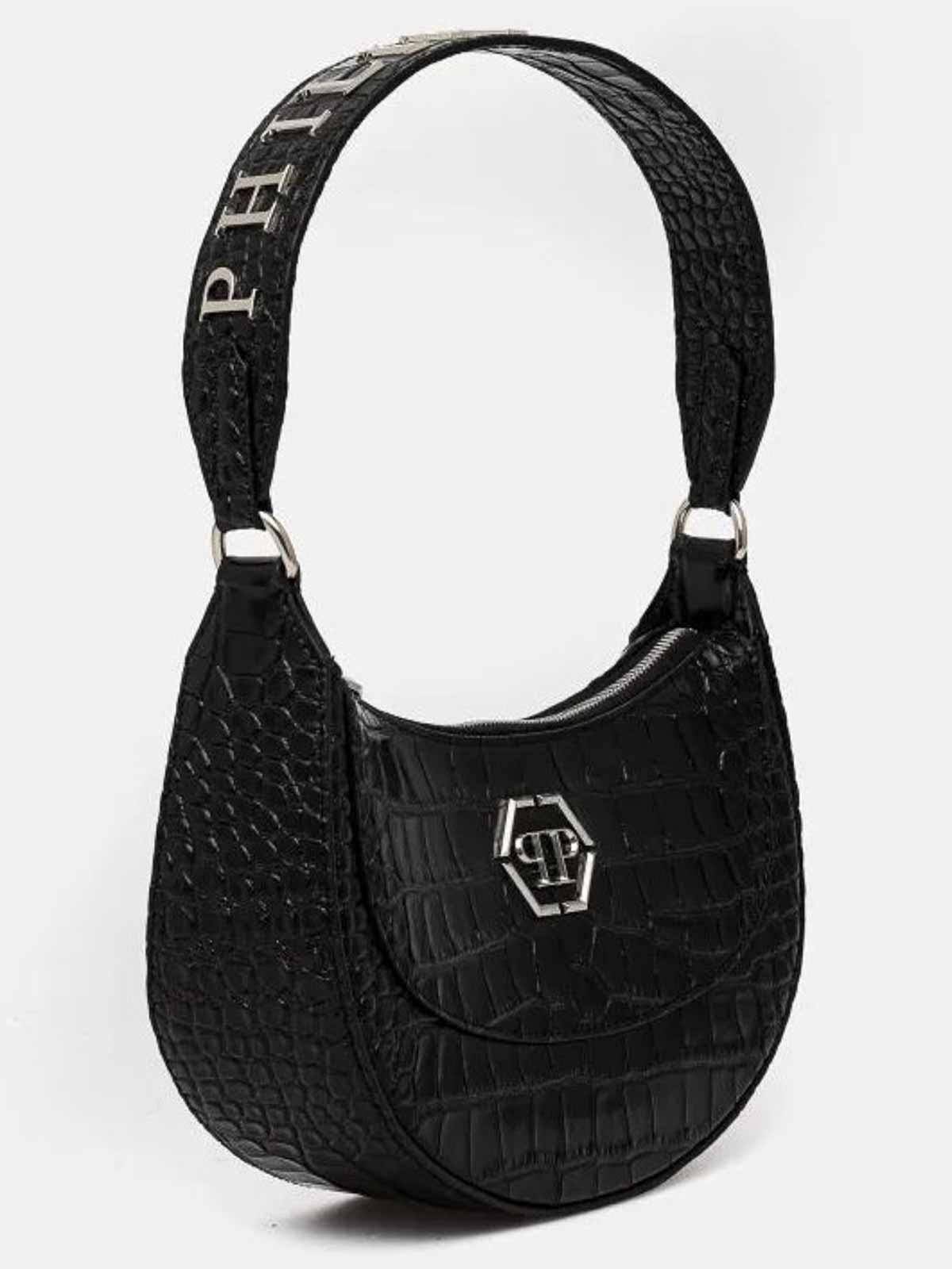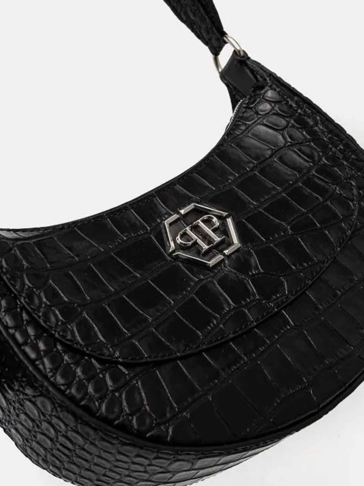 Philipp plein designer shoulder bag . made of grained leather with front logo . on the handle, brand inscription in applied metal plate . inside pocket and card compartment
