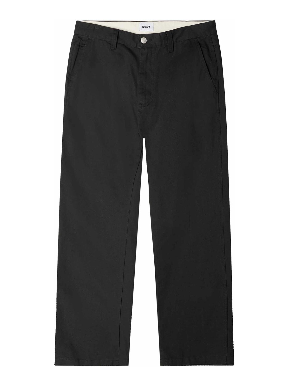 Men's trousers in sturdy 12 oz cotton twill with a regular fit and straight leg, designed for an urban workwear style. They feature a button and zip closure, large front pockets, a coin pocket, typical carpenter tool pockets on the side, and back patch pockets. The embroidered Obey Eyes logo detail on the back pocket. The classic, deep, and versatile black color is ideal for street style looks, work outfits, or casual outfits with character.
